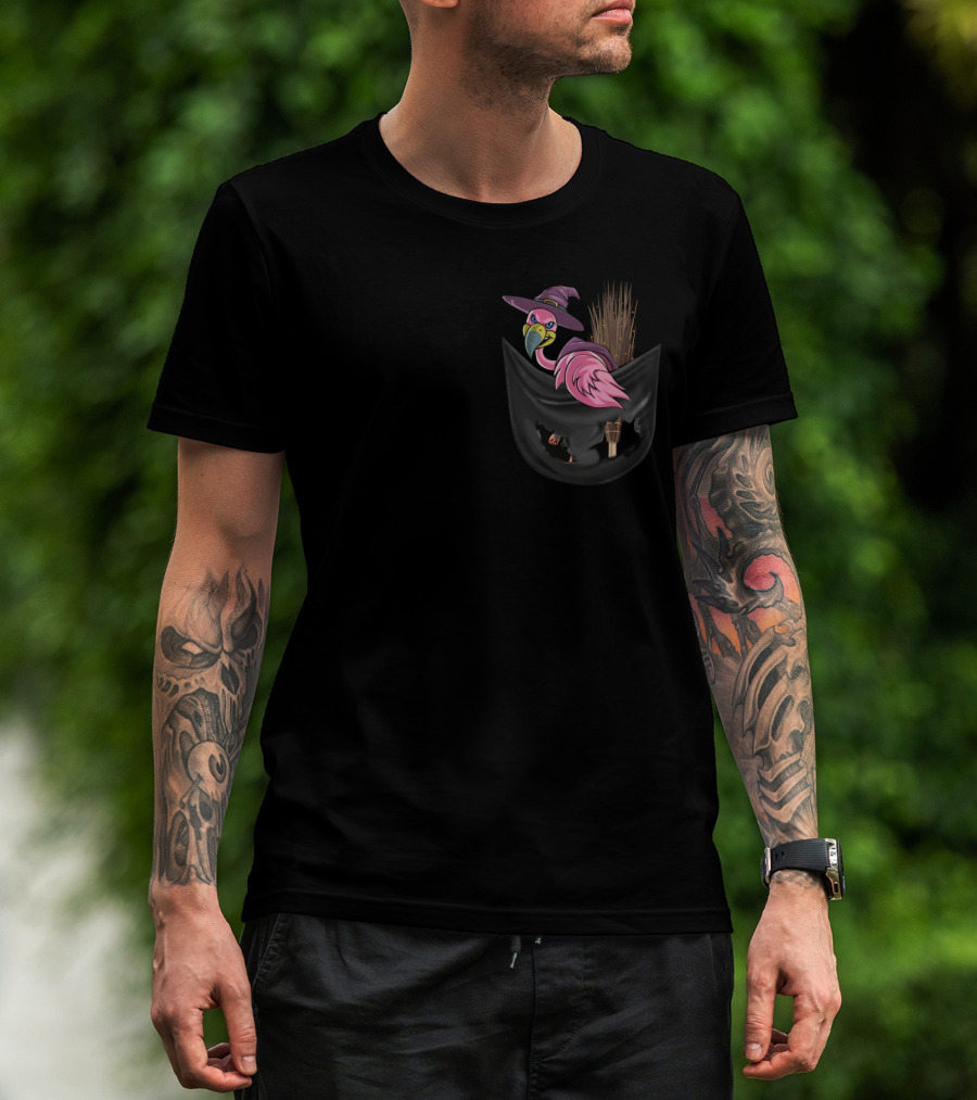 Flamingo In Witch Hat On Broomstick In Halloween Pocket T-Shirt