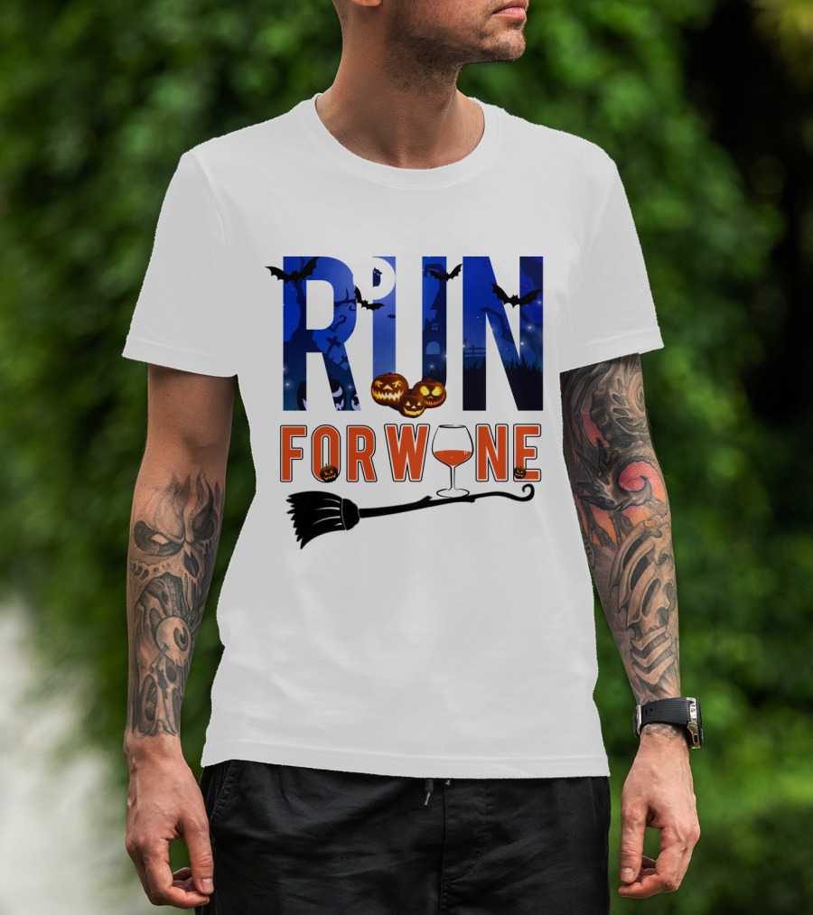 Halloween Run For Wine With Bats, Pumpkins, Witch's Broom, And Wine Glass T-Shirt