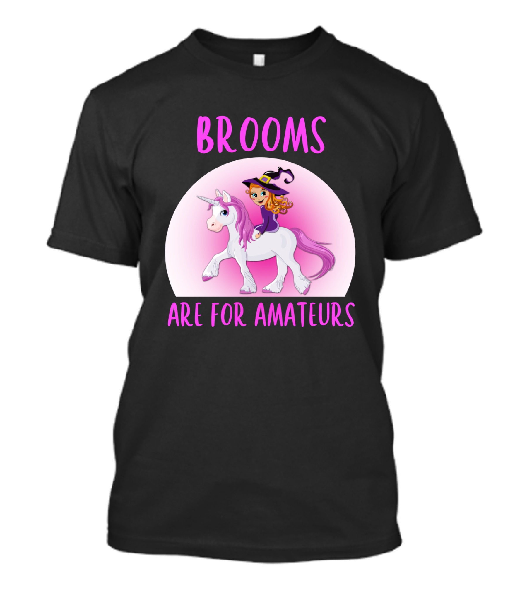 The Brooms Are For Amateurs Witch Riding Unicorn Fantasy T-shirt is designed for everyday wear and a consistent fit. Fabric is pre-shrunk ring-spun cotton with durable stitching. See the size chart below for exact measurements.