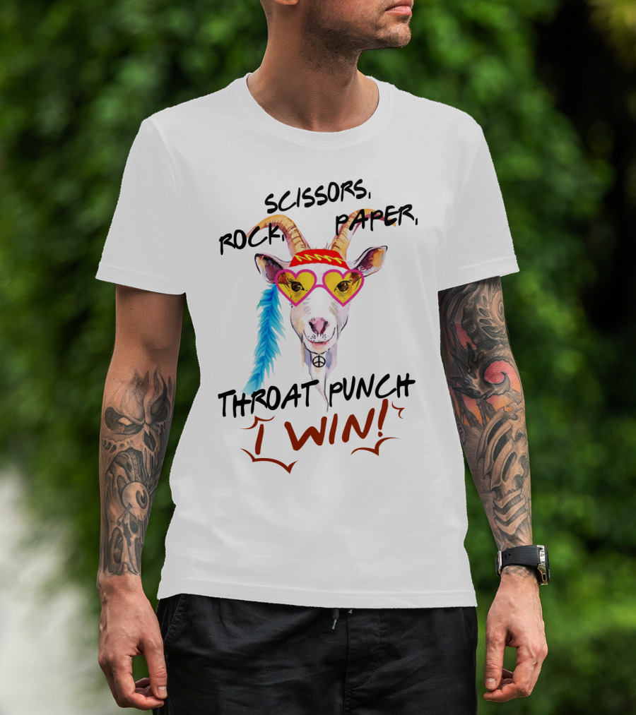 The Scissors Rock Paper Goat Throat Punch I Win Peace Sign Heart Glasses T-shirt is designed for everyday wear and a consistent fit. Fabric is pre-shrunk ring-spun cotton with durable stitching. See the size chart below for exact measurements.