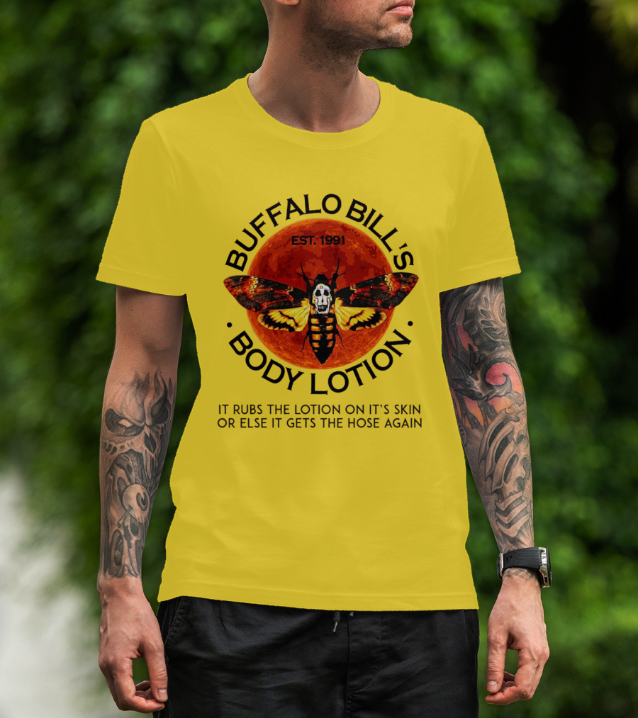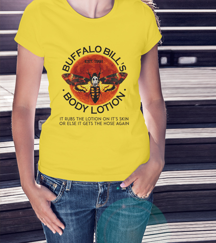The Buffalo Bill's Body Lotion Funny Halloween Horror Moth Skull Vintage 1991 T-shirt is designed for everyday wear and a consistent fit. Fabric is pre-shrunk ring-spun cotton with durable stitching. See the size chart below for exact measurements.