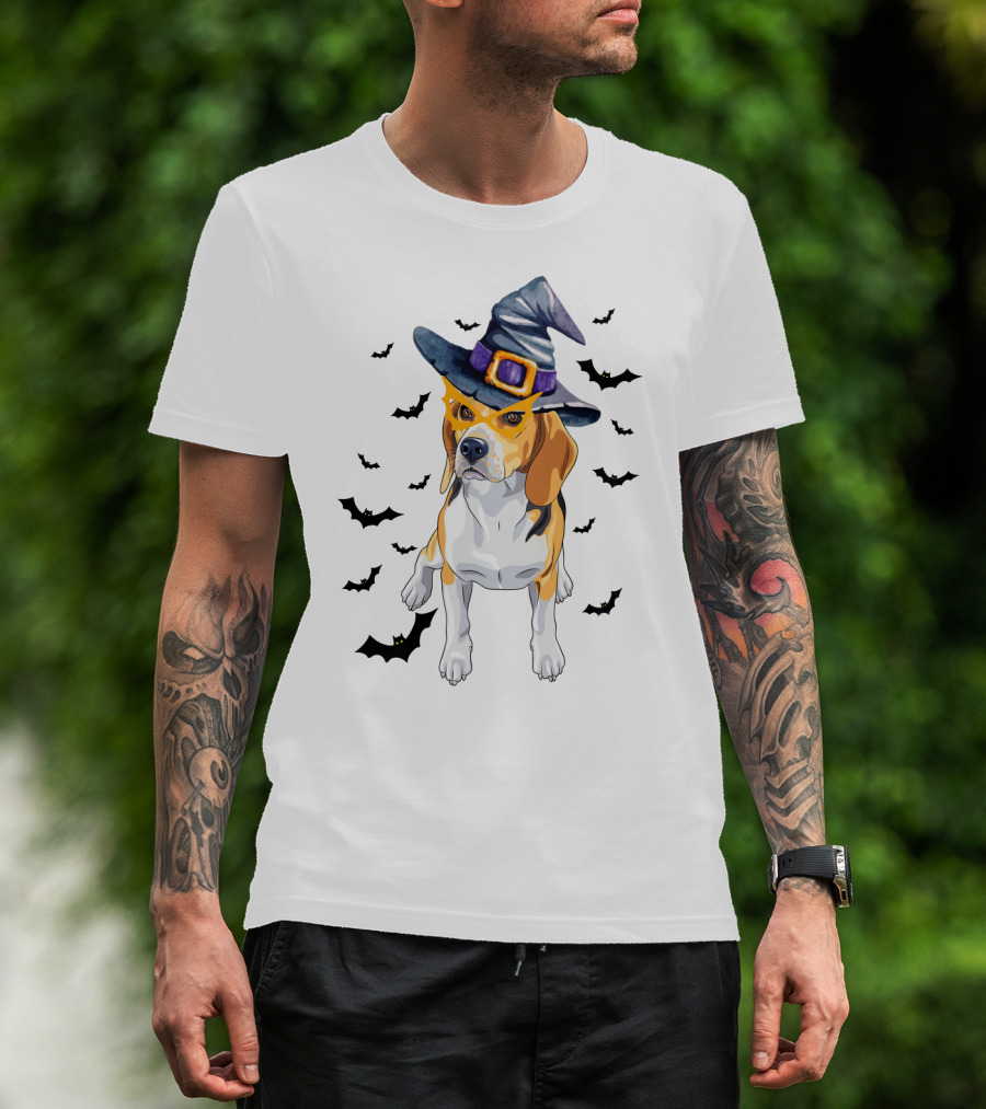 Beagle Wears Halloween Witch Hat Surrounded By Flying Bats T-Shirt