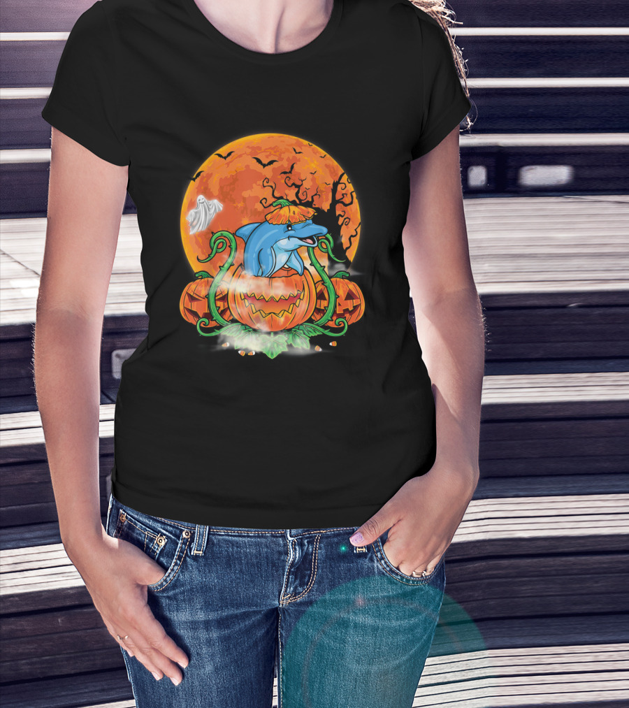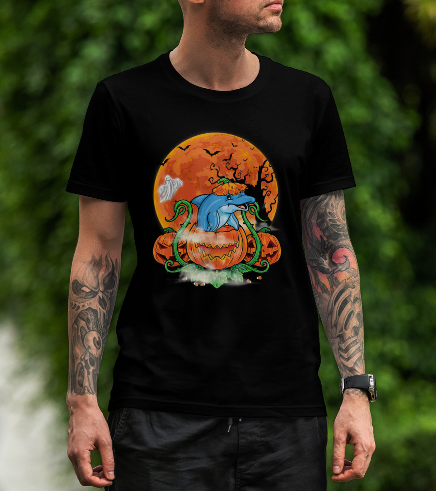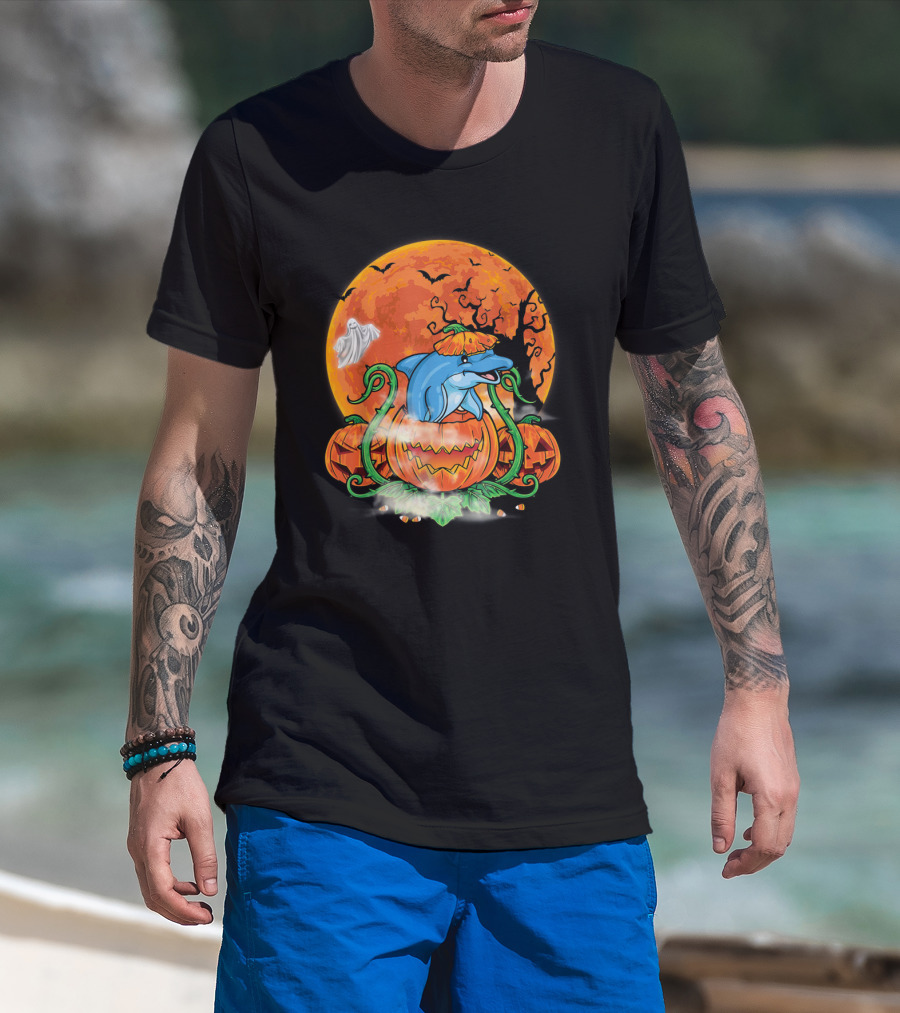 Dolphin Inside Pumpkin With Halloween Moon And Ghost T-Shirt