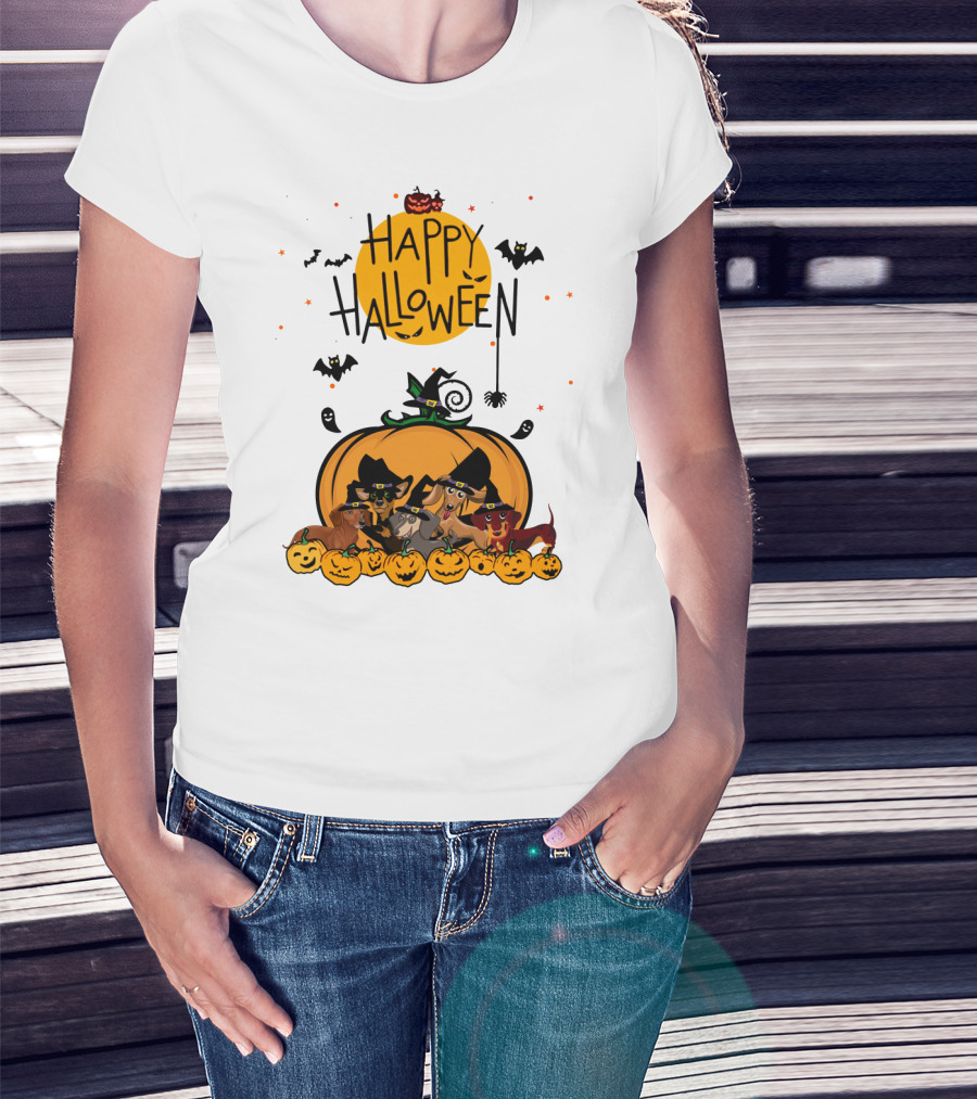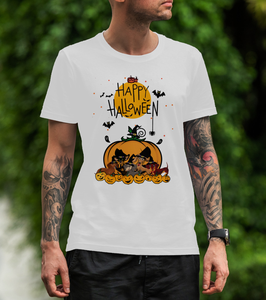 Happy Halloween Dachshunds With Witch Hats And Pumpkins T-Shirt