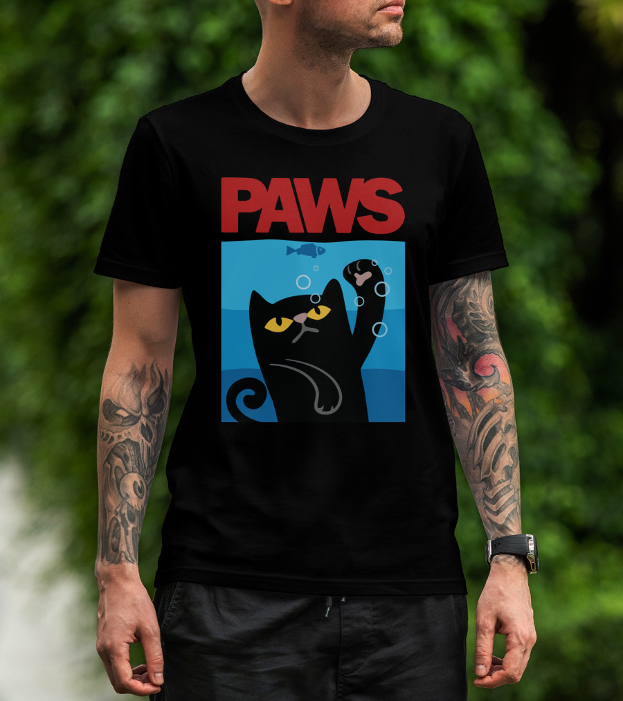 PAWS Jaws Parody Black Cat With Fish In Water T-Shirt