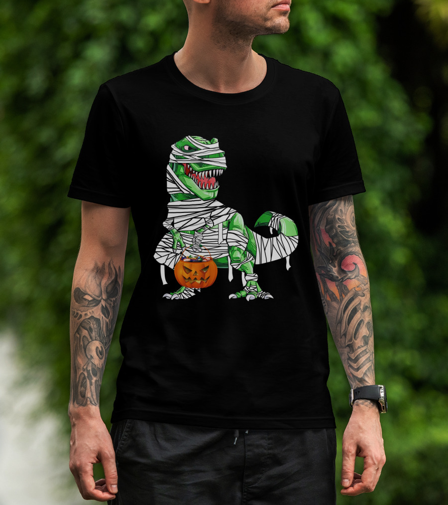 Halloween Pumpkin Mummy Dinosaur With Candy Bucket T-Shirt
