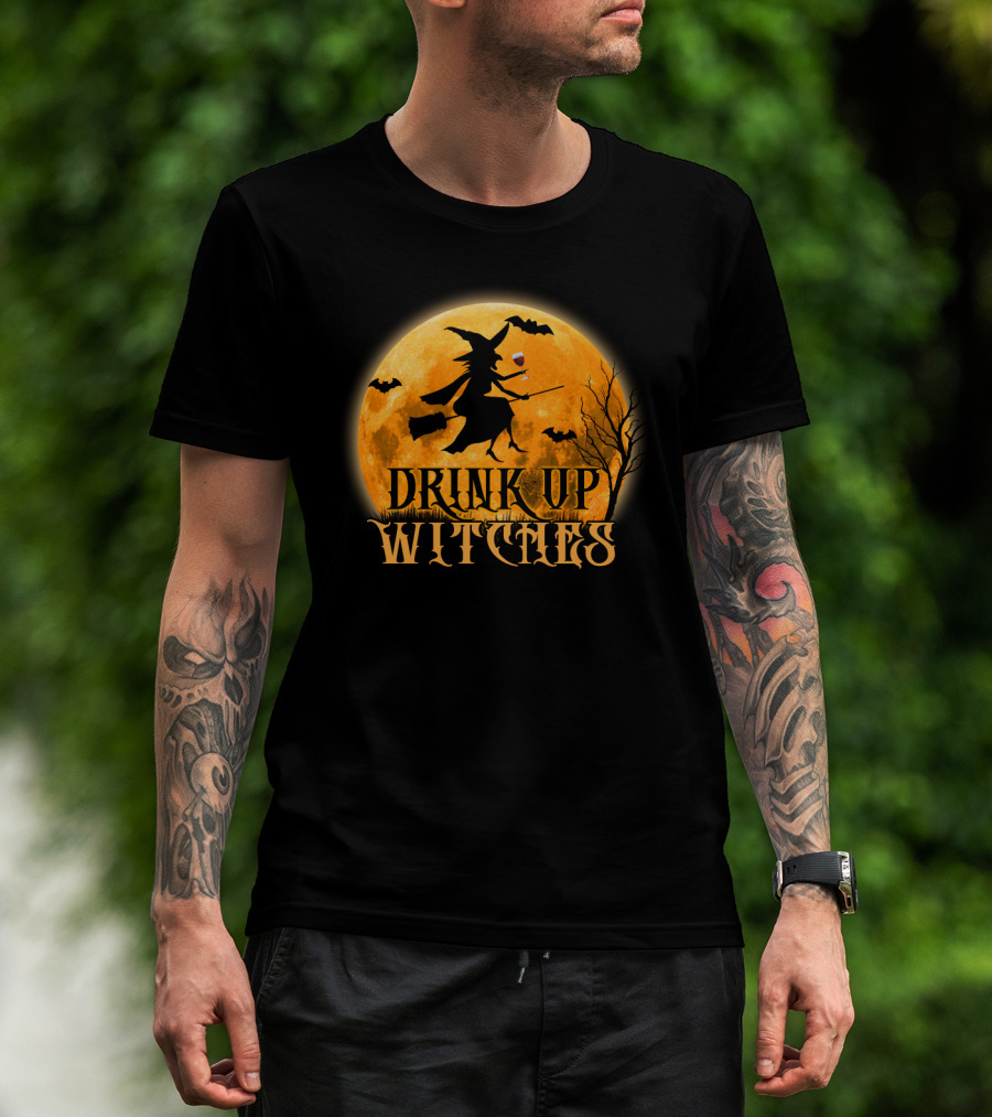 Drink Up Witches Wine Halloween Moon Bats Broomstick T-Shirt
