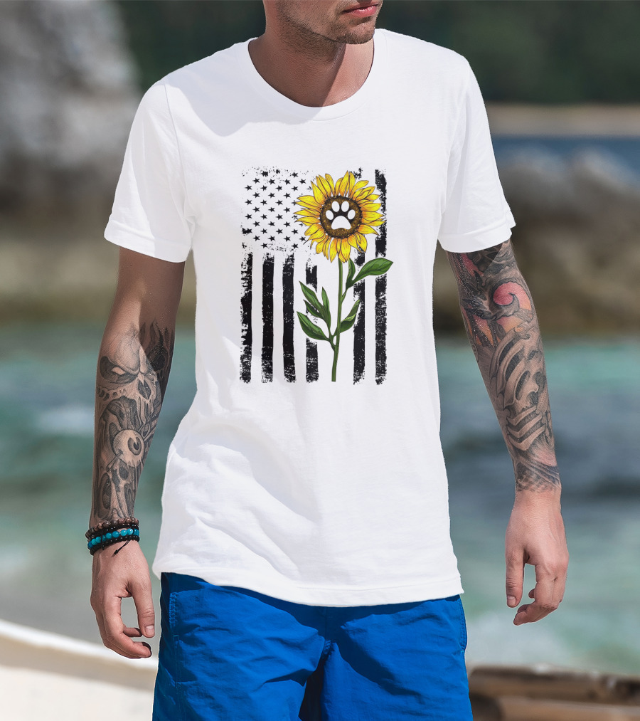 Sunflower Dog Paw Over American Flag Background T-Shirt