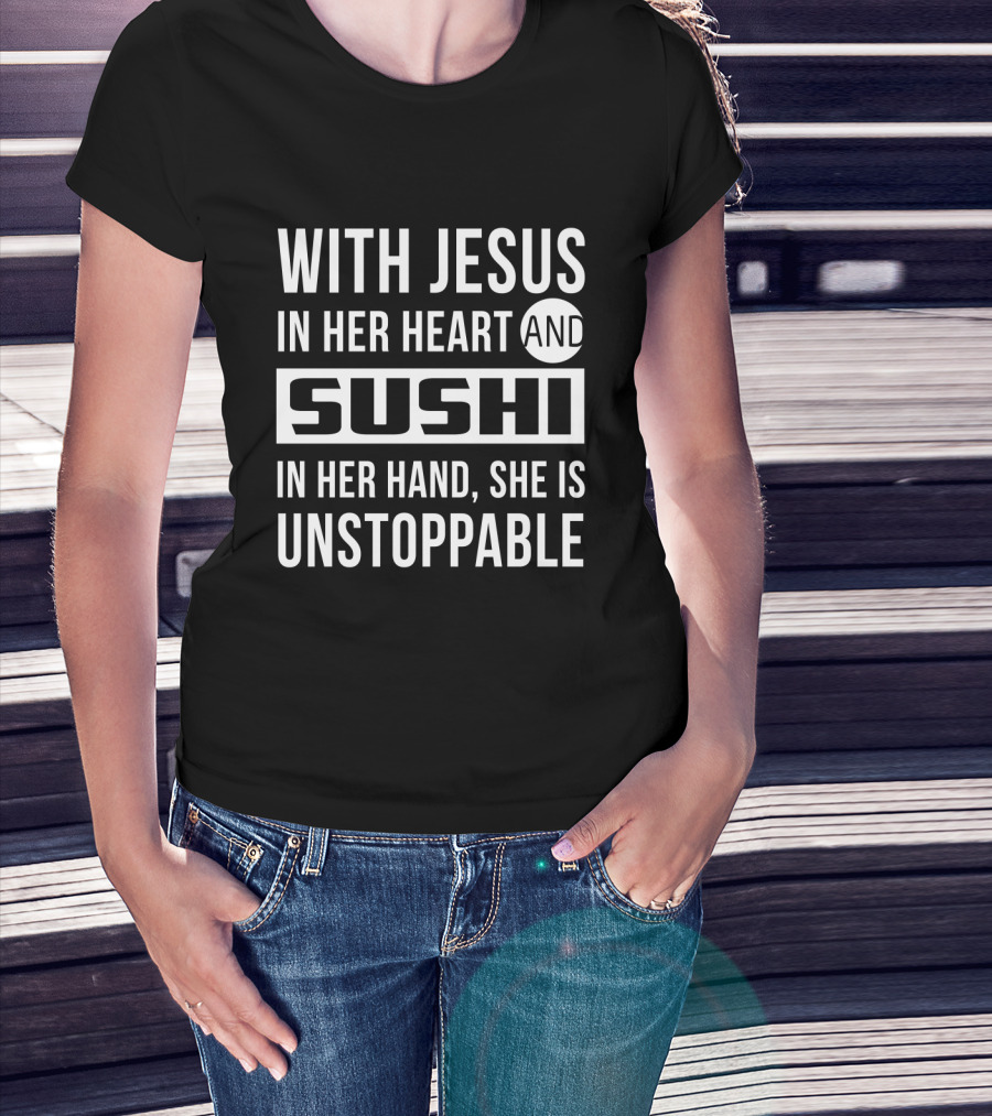 With Jesus In Her Heart And Sushi In Her Hand She Is Unstoppable T-Shirt