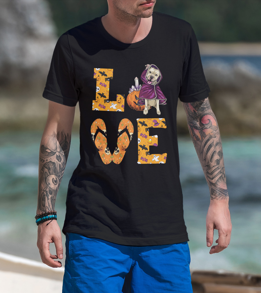 Halloween Pitbull Dog LOVE Candy Pumpkin Ghosts Bats Skeletons Costume T-Shirt