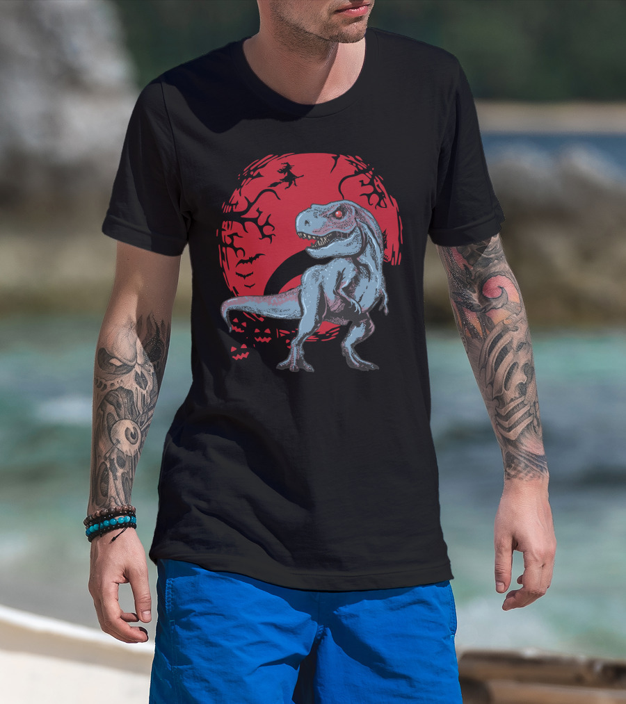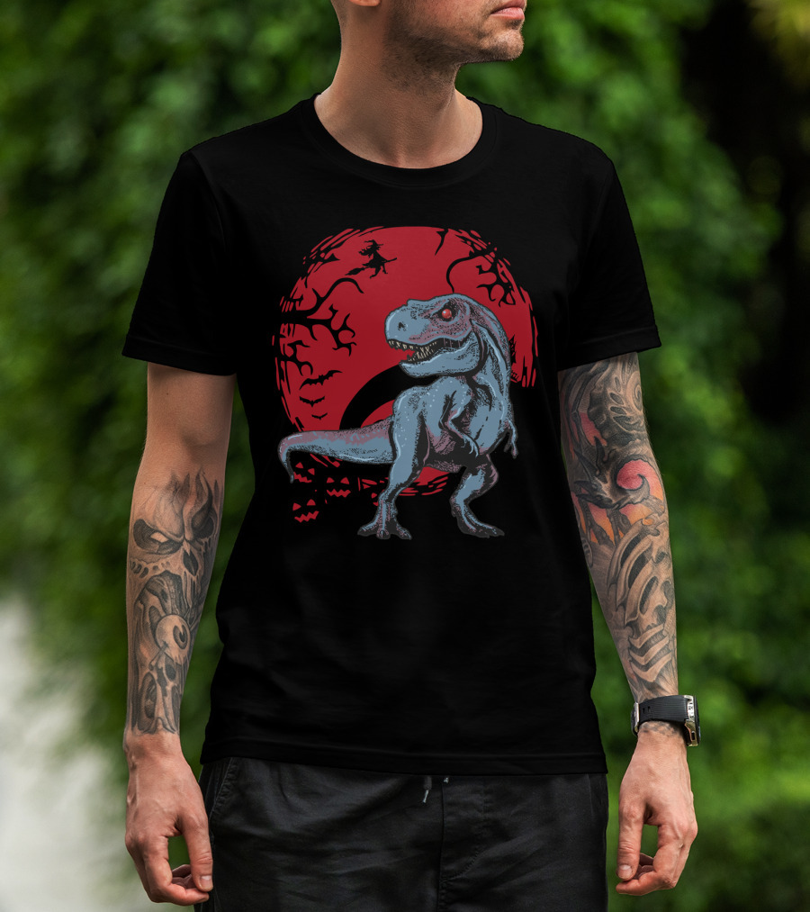 Halloween Dinosaurs T-Rex Red Moon With Witch And Bats T-Shirt
