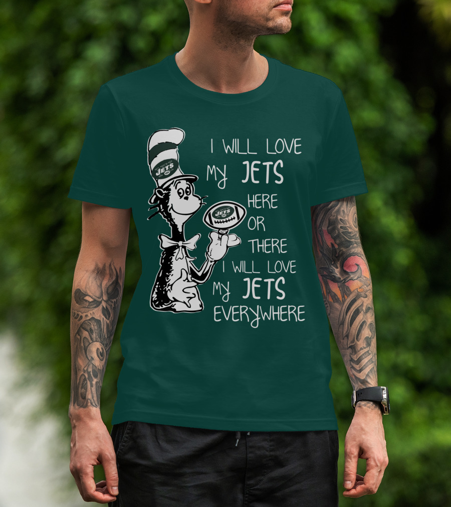I Will Love My Jets Here Or There I Will Love My Jets Everywhere Cat In The Hat Football Fan T-Shirt