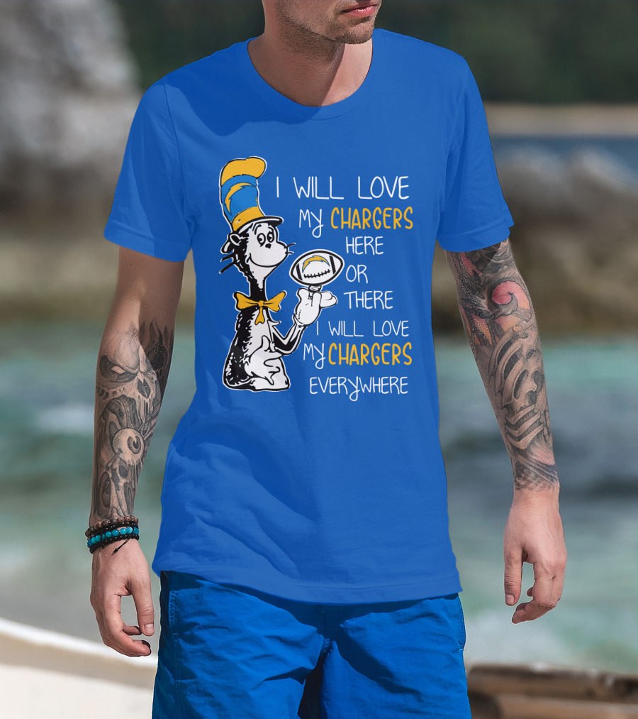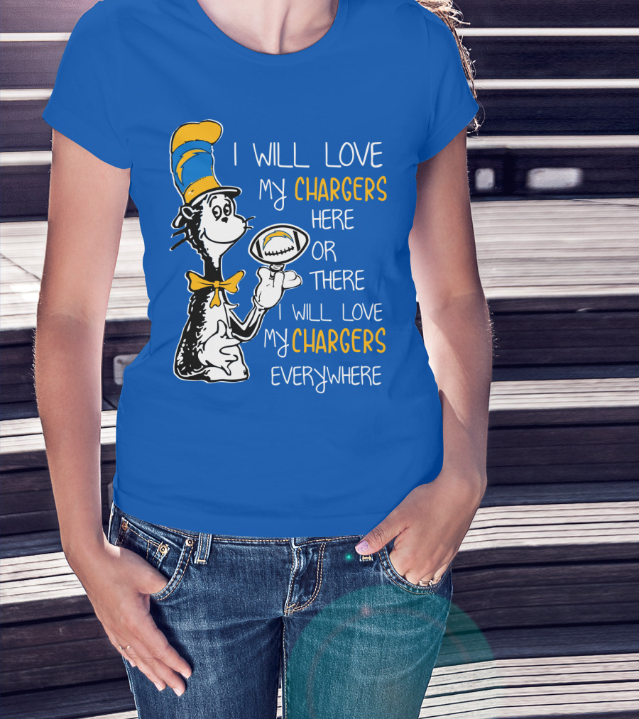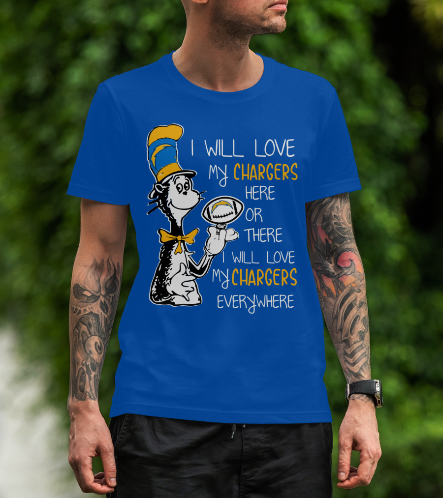 I Will Love My Chargers Here Or There I Will Love My Chargers Everywhere Cat In The Hat Football T-Shirt