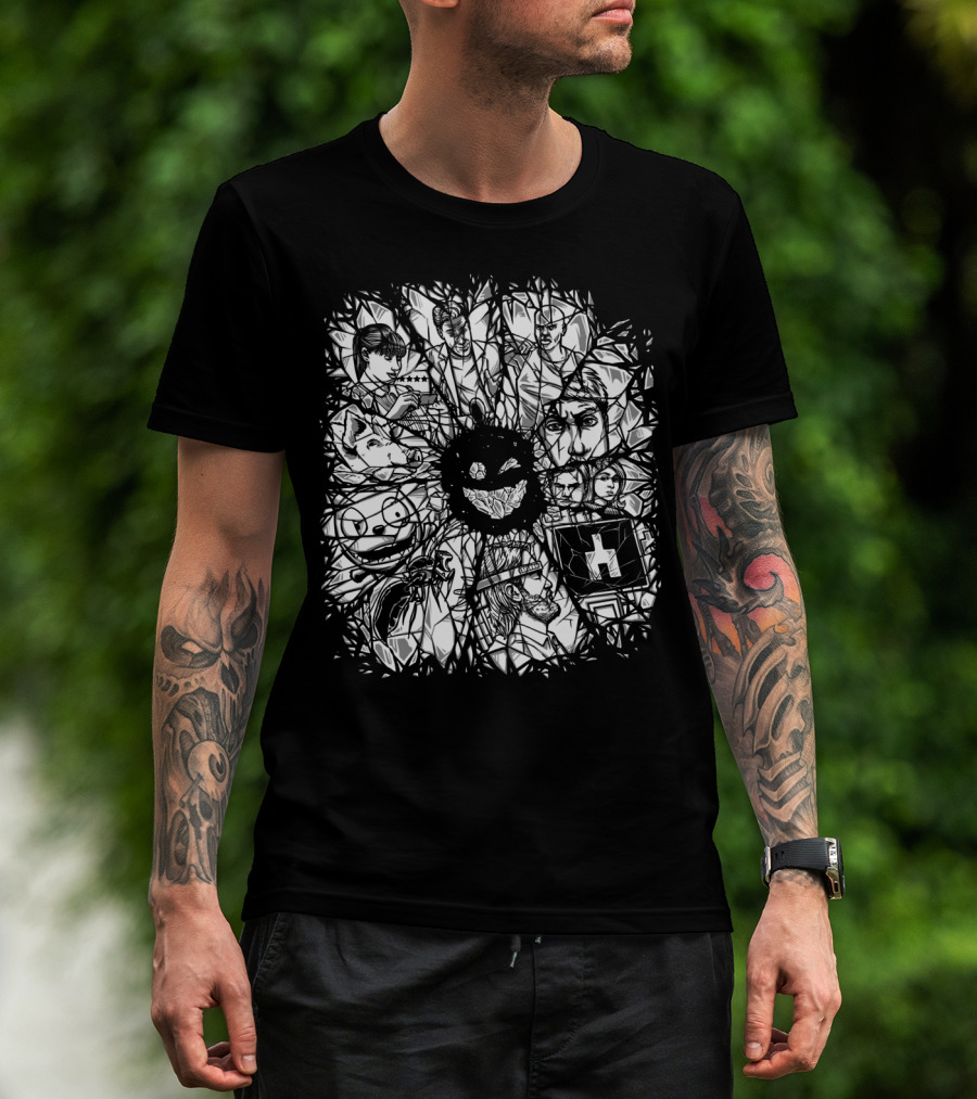 The Black Mirror Dark Refractions Iconic Episodes Symbolic Imagery Collection T-shirt is designed for everyday wear and a consistent fit. Fabric is pre-shrunk ring-spun cotton with durable stitching. See the size chart below for exact measurements.