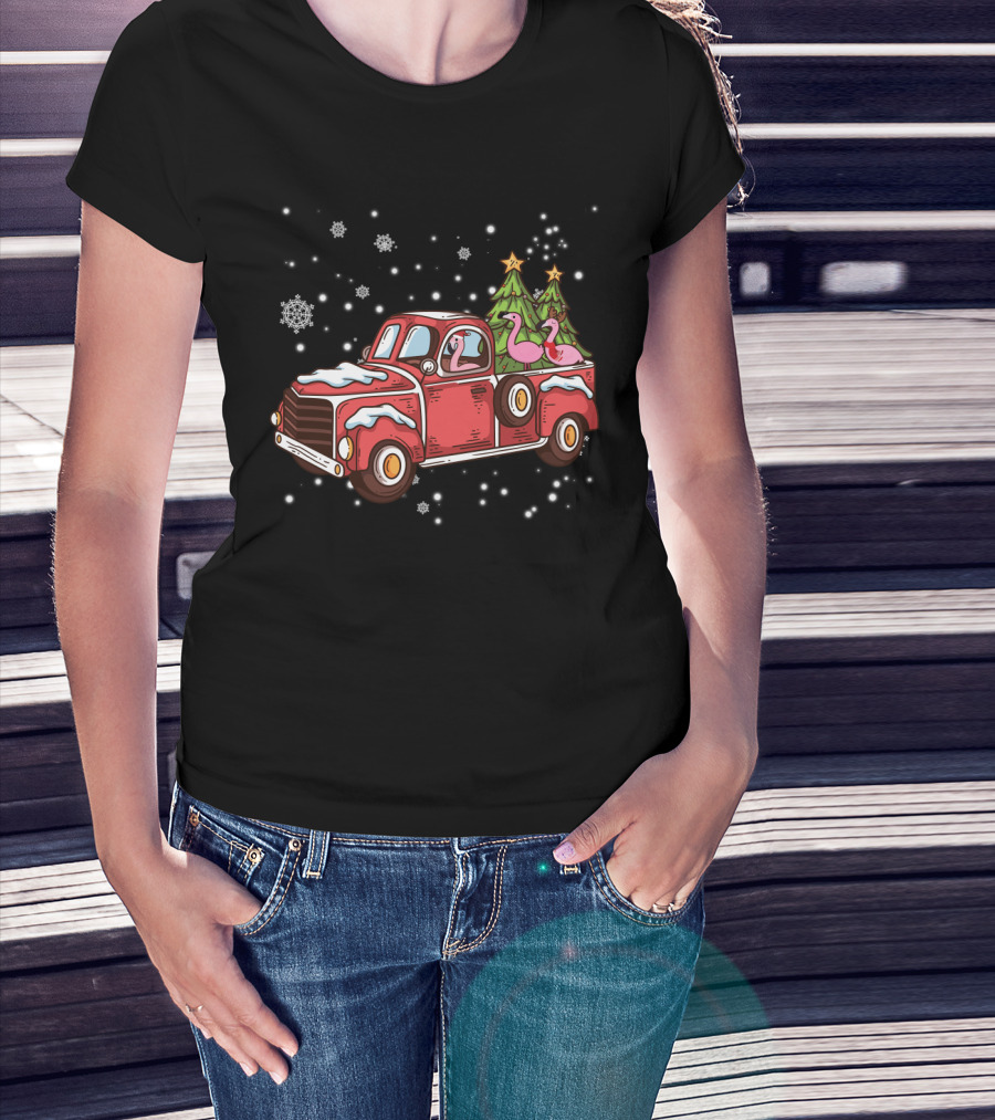 Christmas Flamingos Riding In Red Truck With Snowflakes And Christmas Trees T-Shirt
