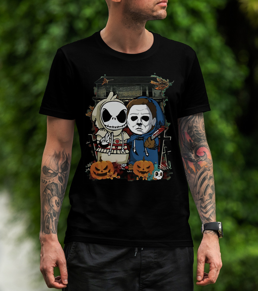 Jack Skellington Michael Myers Halloween Mashup With Pumpkins And Haunted House Background T-Shirt