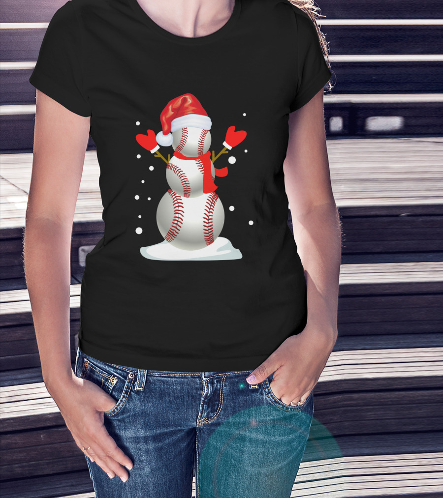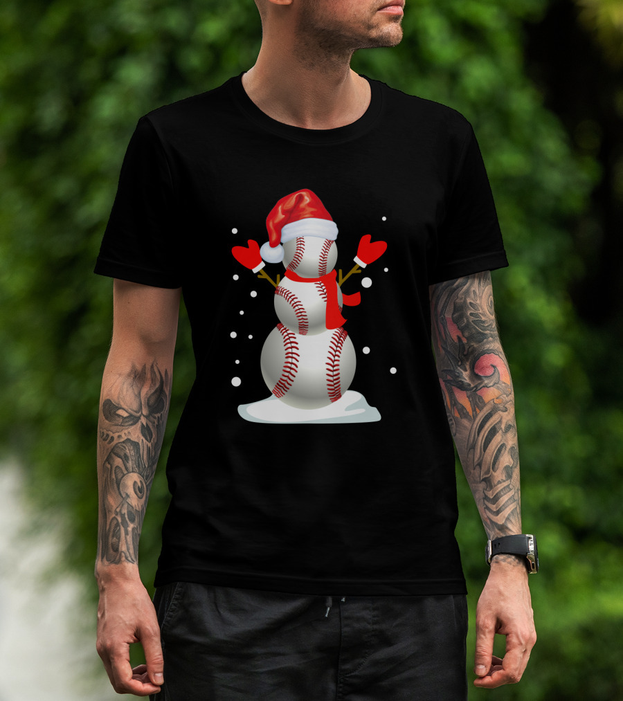 Baseball-Themed Snowman With Santa Hat And Mittens Winter Holiday T-Shirt
