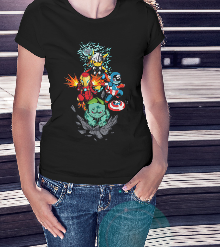 The Pikachu Thor Iron Man Iron Pikachu Captain America Charmander Bulbasaur PokEmon Avengers T-shirt is designed for everyday wear and a consistent fit. Fabric is pre-shrunk ring-spun cotton with durable stitching. See the size chart below for exact measurements.