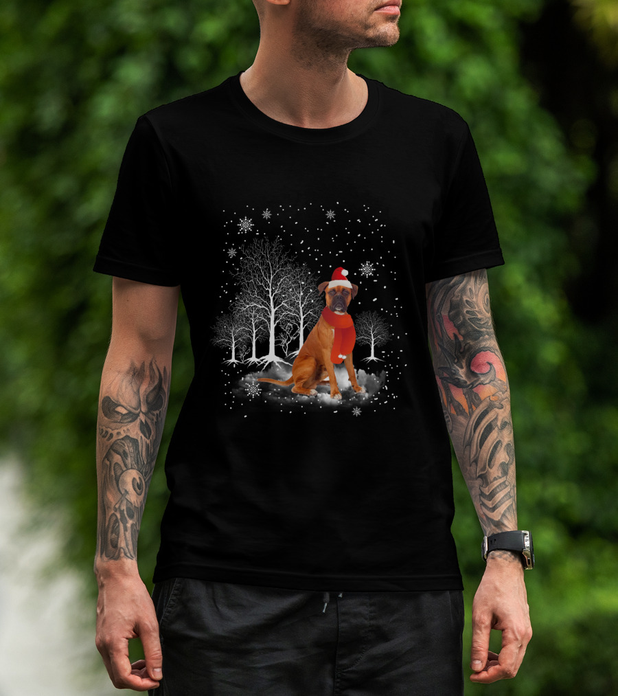 Boxer Dog With Santa Hat And Scarf In Snowy Winter Wonderland Scene T-Shirt