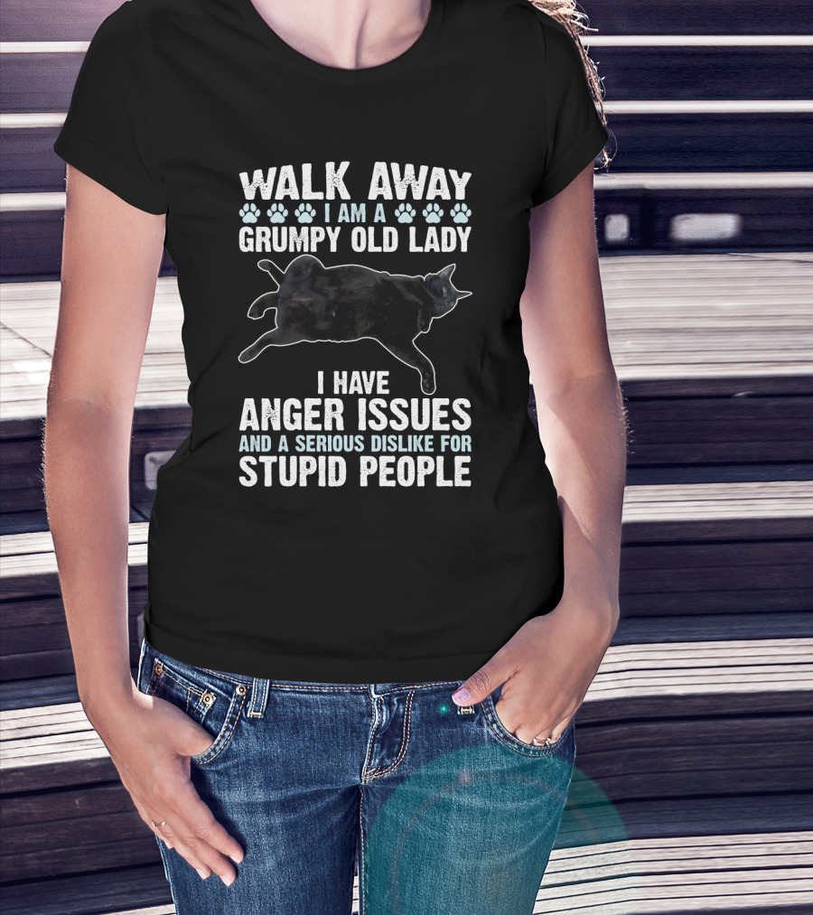 Walk Away I Am A Grumpy Old Lady Black Cat Anger Issues Dislike For Stupid People T-Shirt