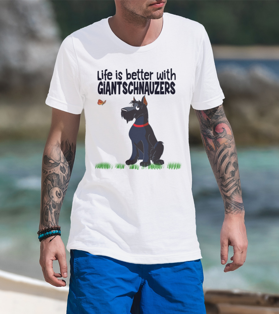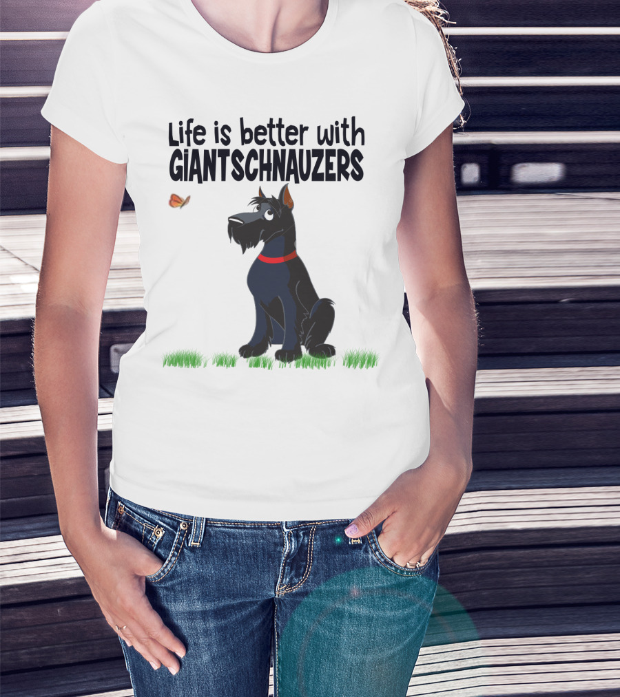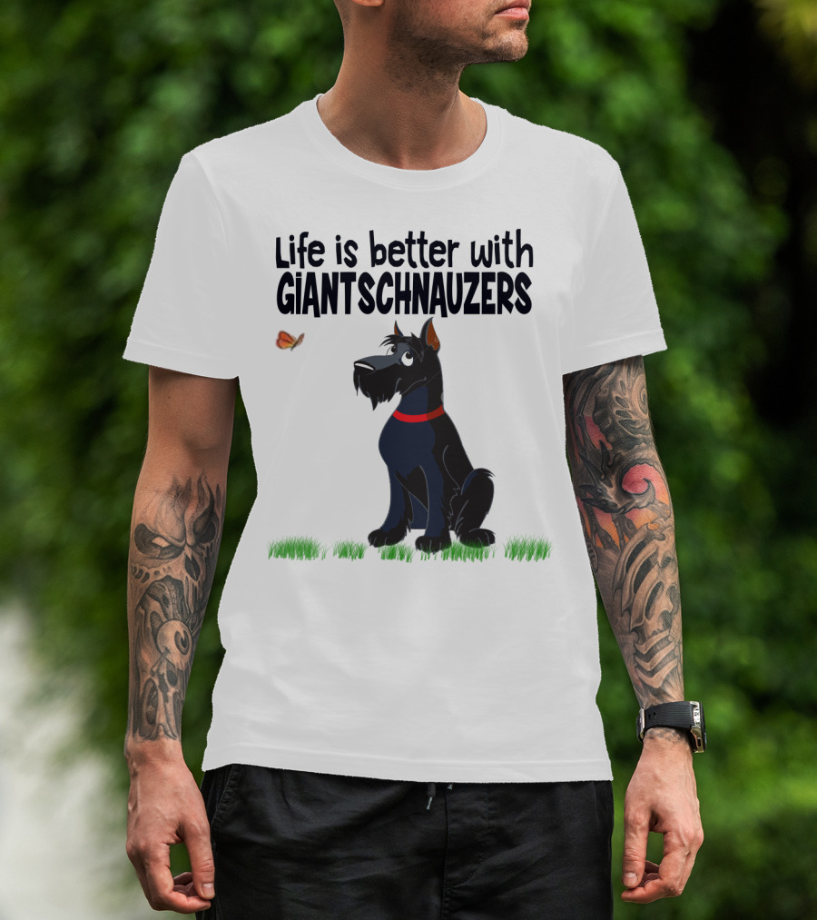 Life Is Better With Giant Schnauzers Playful Cartoon Dog And Butterfly In Grass T-Shirt