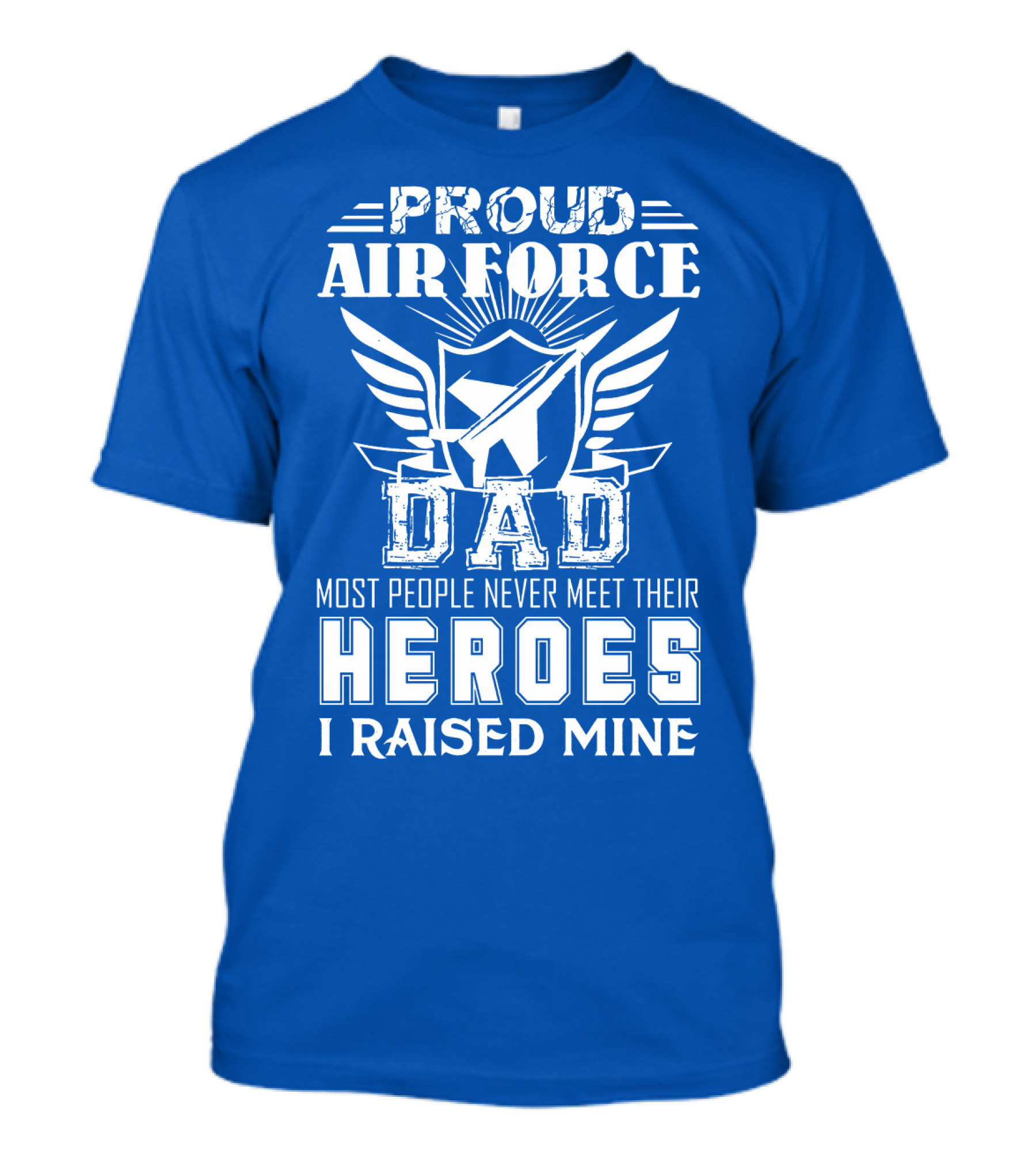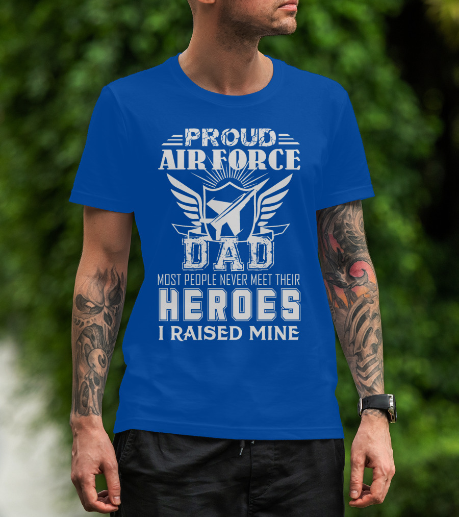 The Proud Air Force Dad Most People Never Meet Their Heroes I Raised Mine T-shirt is designed for everyday wear and a consistent fit. Fabric is pre-shrunk ring-spun cotton with durable stitching. See the size chart below for exact measurements.