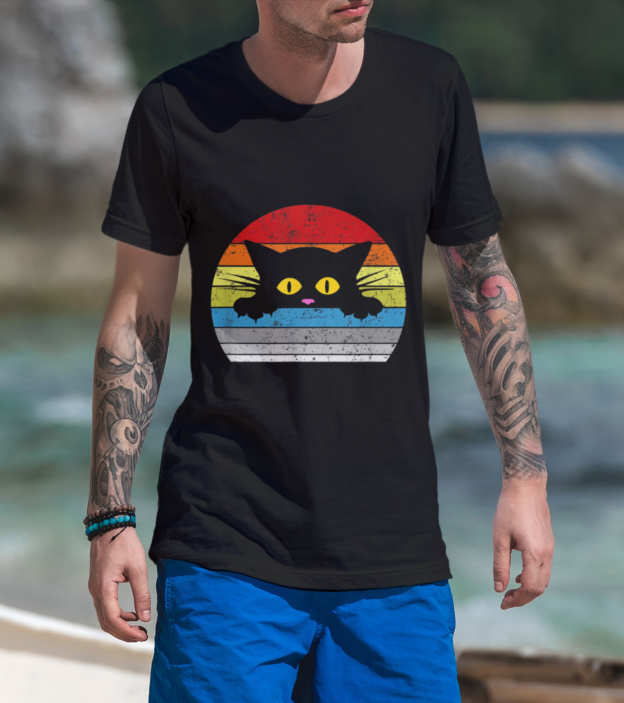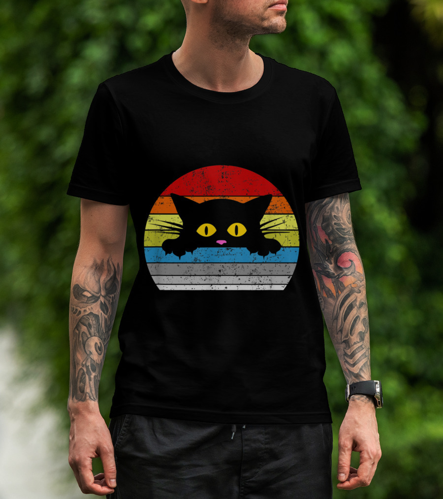 The Vintage Rainbow Cat Peeking Retro 80s Style for Cat Lovers T-shirt is designed for everyday wear and a consistent fit. Fabric is pre-shrunk ring-spun cotton with durable stitching. See the size chart below for exact measurements.