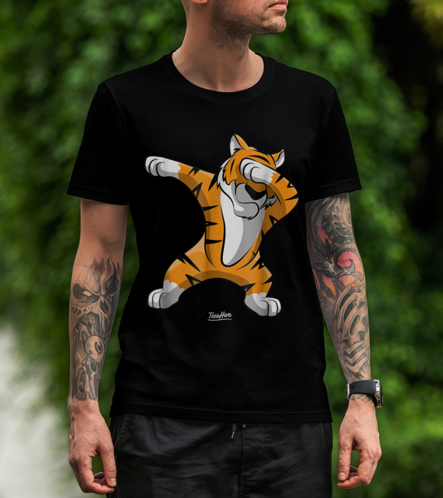 The TeesHive Dabbing Tiger Funny Safari Animal Dab Tiger T-shirt is designed for everyday wear and a consistent fit. Fabric is pre-shrunk ring-spun cotton with durable stitching. See the size chart below for exact measurements.