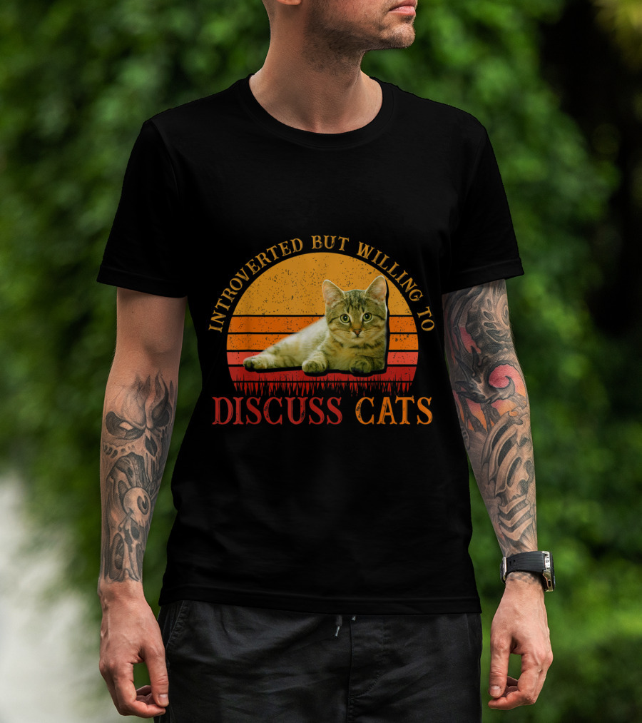 The Introverted But Willing to Discuss Cats with Vintage Sunset Cat T-shirt is designed for everyday wear and a consistent fit. Fabric is pre-shrunk ring-spun cotton with durable stitching. See the size chart below for exact measurements.
