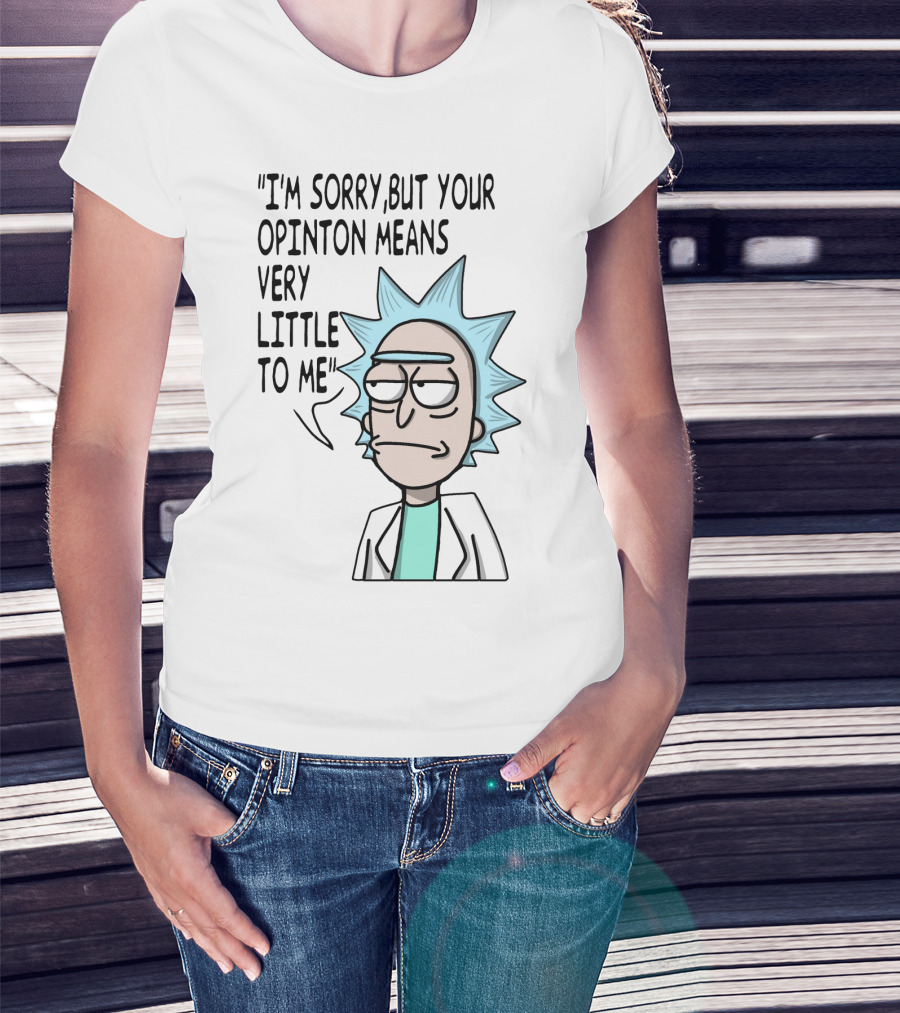 The Rick Expression with I'm Sorry But Your Opinion Means Very Little to Me Text T-shirt is designed for everyday wear and a consistent fit. Fabric is pre-shrunk ring-spun cotton with durable stitching. See the size chart below for exact measurements.