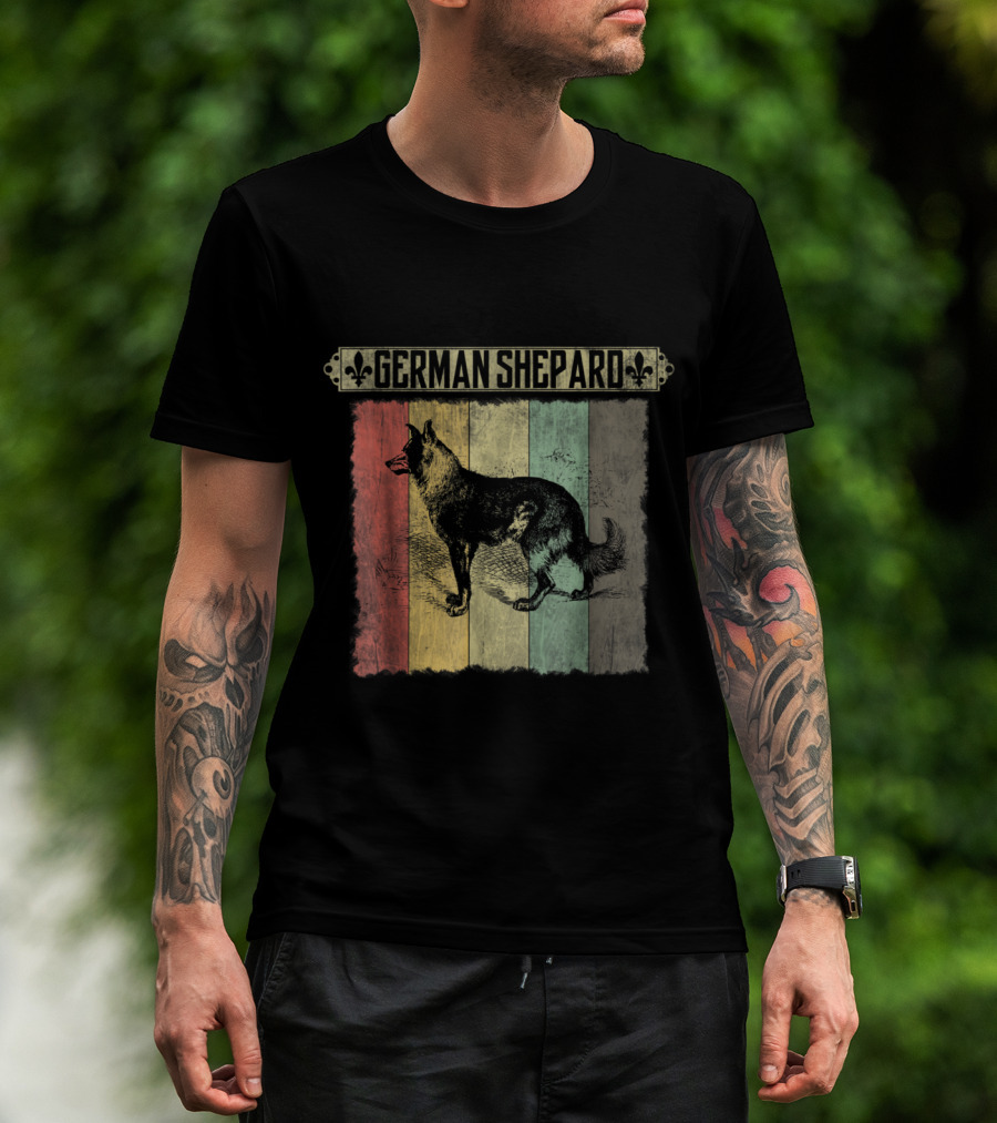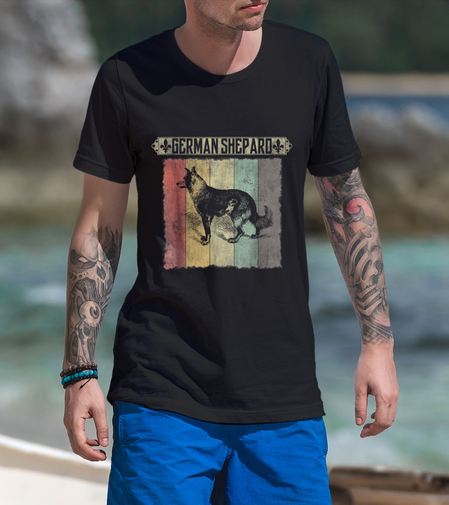 The German Shepard Vintage Retro Distressed Style with Colorful Stripes T-shirt is designed for everyday wear and a consistent fit. Fabric is pre-shrunk ring-spun cotton with durable stitching. See the size chart below for exact measurements.