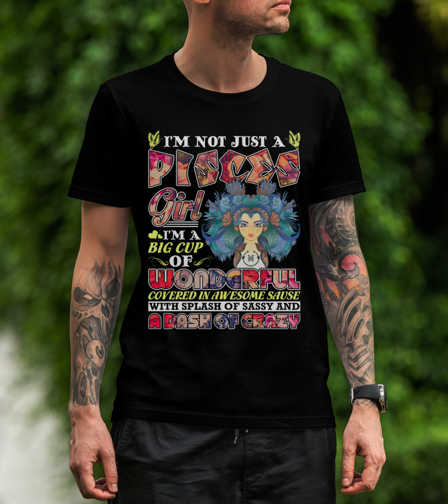 The I'm Not Just A Pisces Girl Big Cup Of Wonderful Covered In Awesome Sauce With Splash Of Sassy And A Dash Of Crazy T-shirt is designed for everyday wear and a consistent fit. Fabric is pre-shrunk ring-spun cotton with durable stitching. See the size chart below for exact measurements.
