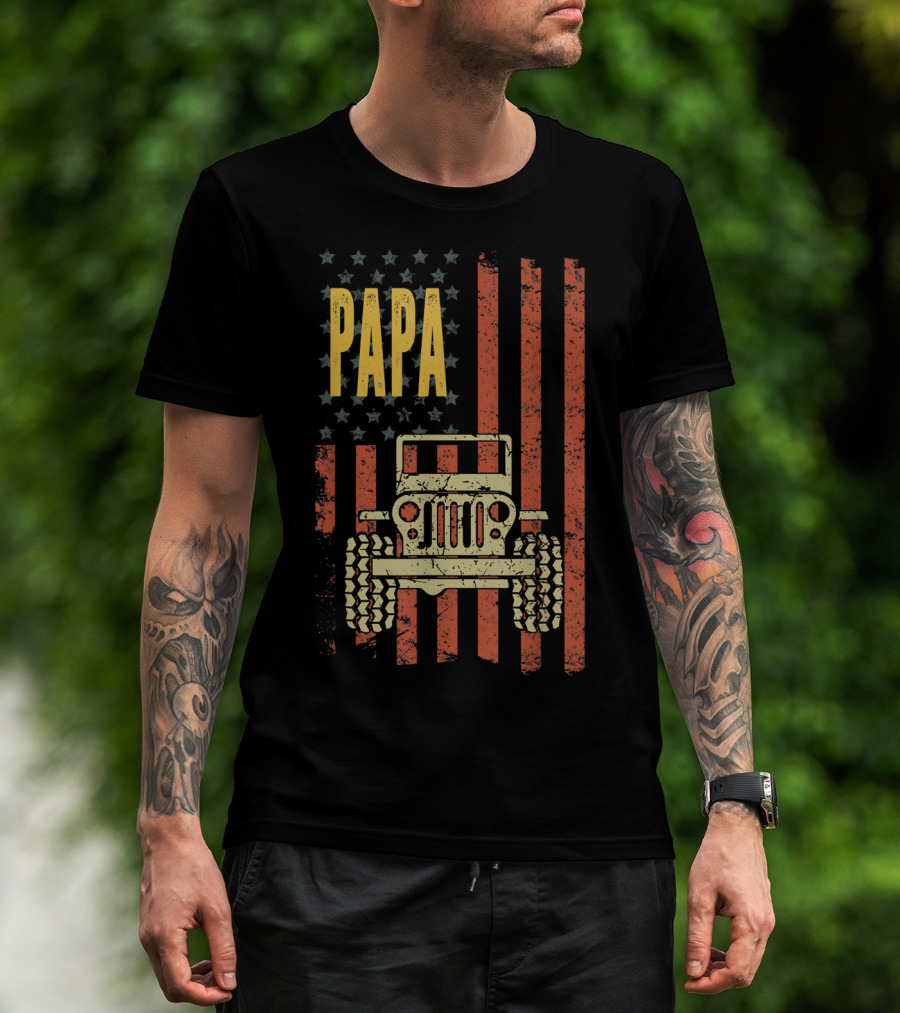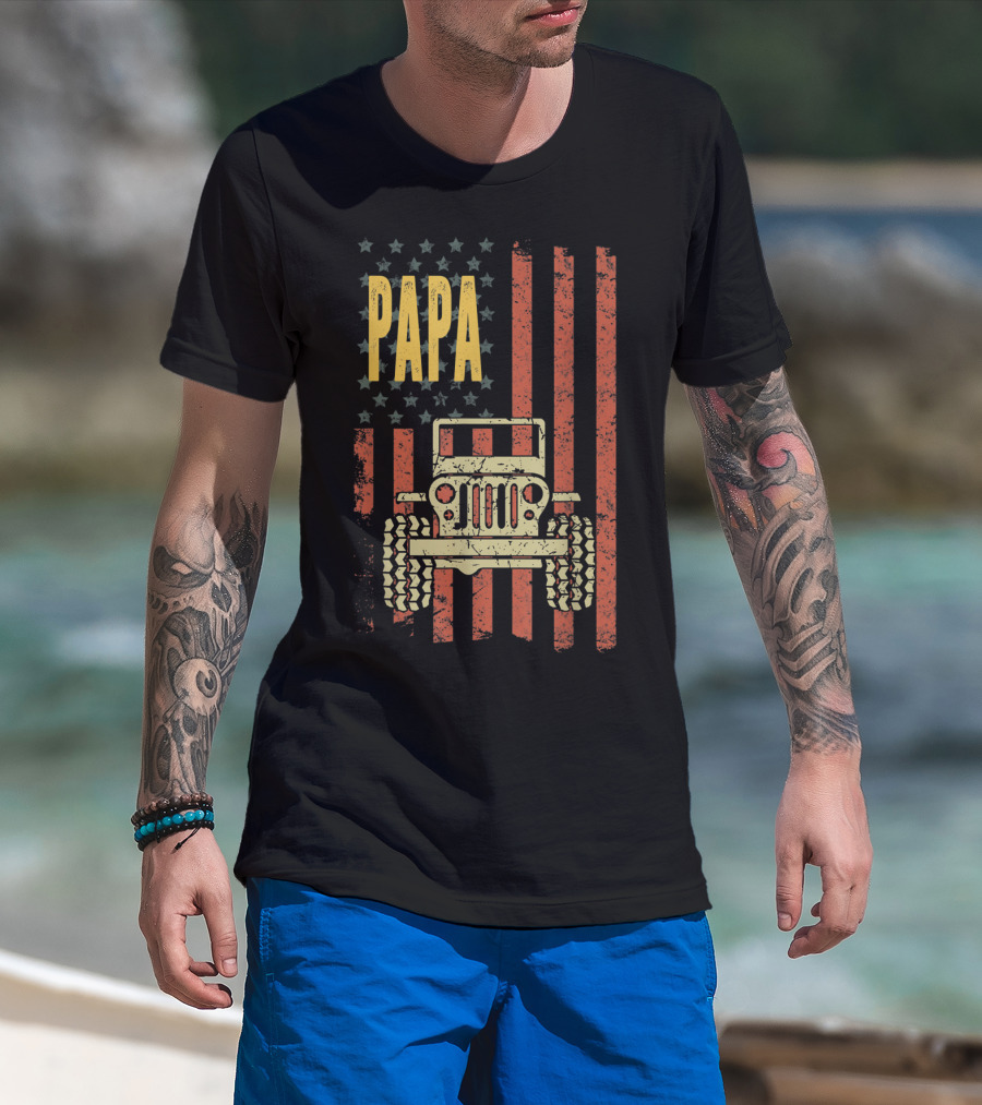 The Papa American Flag Vintage Jeeps T-shirt is designed for everyday wear and a consistent fit. Fabric is pre-shrunk ring-spun cotton with durable stitching. See the size chart below for exact measurements.