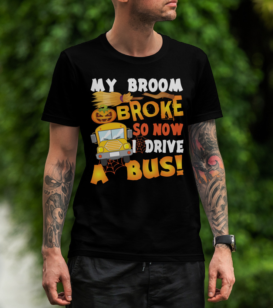 Funny School Bus Driver Lady My Broom Broke So Now I Drive A Bus With Pumpkin And Broom Graphics T-Shirt