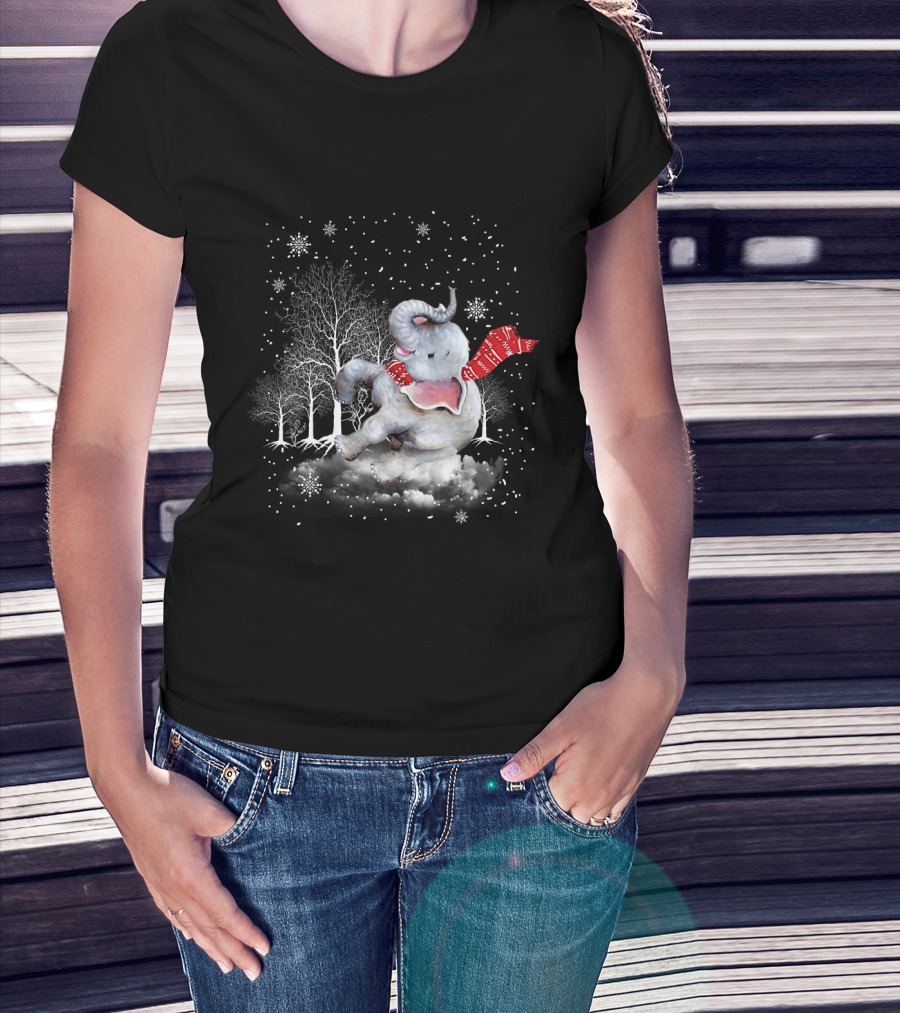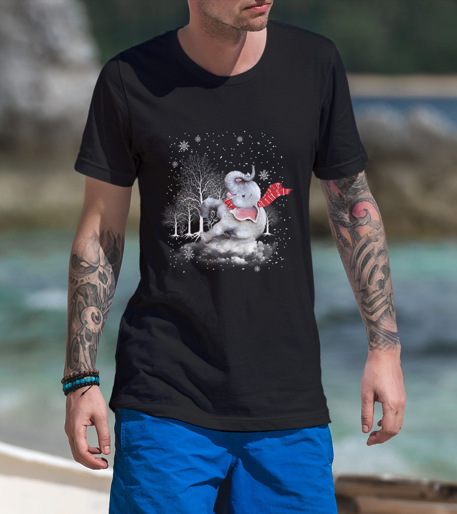Elephant Christmas Snowflake Scarf Winter Forest Scene T-Shirt