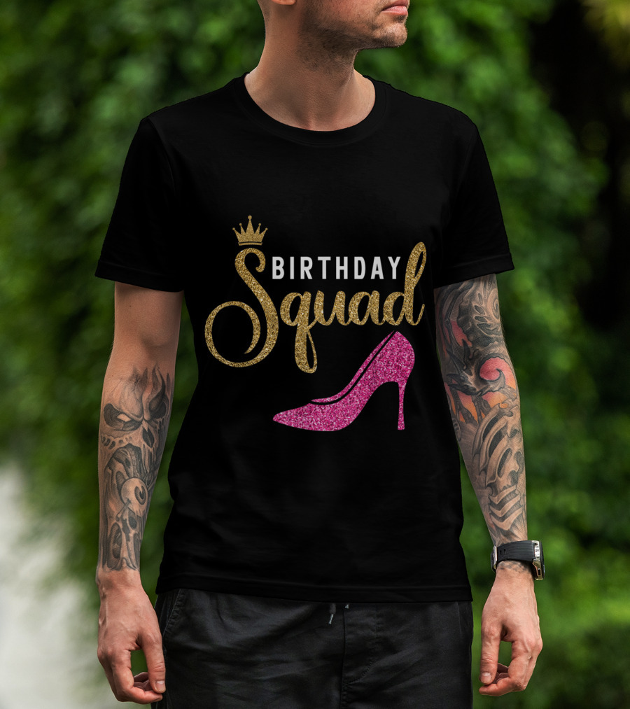 The Birthday Squad Queen Golden Pink Shoe T-shirt is designed for everyday wear and a consistent fit. Fabric is pre-shrunk ring-spun cotton with durable stitching. See the size chart below for exact measurements.