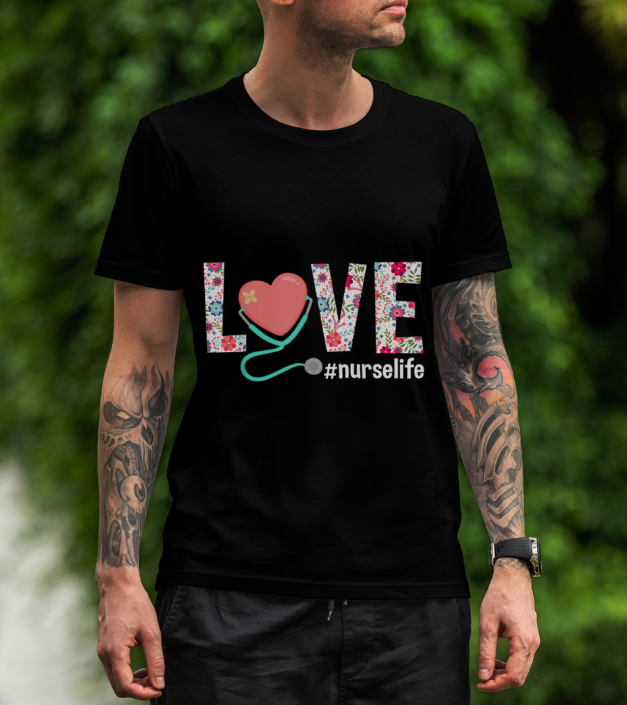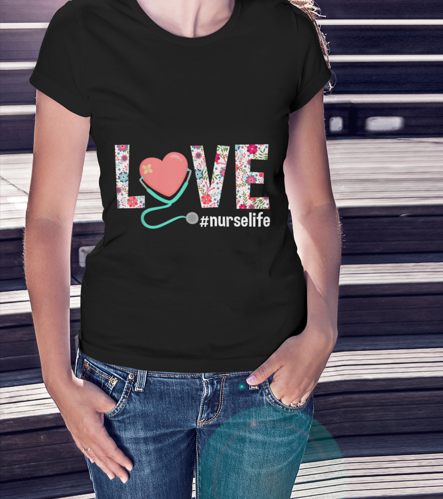 LOVE Stethoscope Heart Floral Design #NurseLife T-Shirt