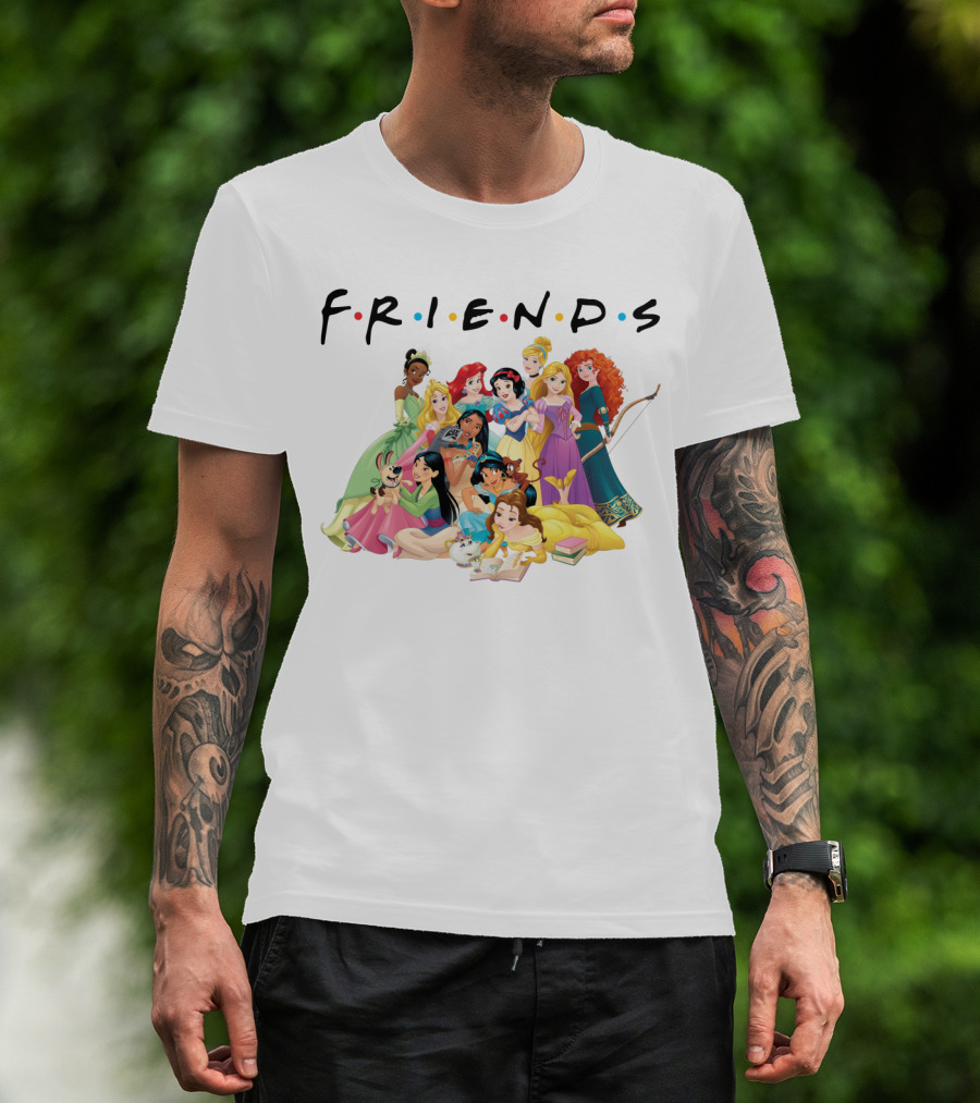 The Friends Disney Princesses Funny Fans Girls Group Iconic T-shirt is designed for everyday wear and a consistent fit. Fabric is pre-shrunk ring-spun cotton with durable stitching. See the size chart below for exact measurements.