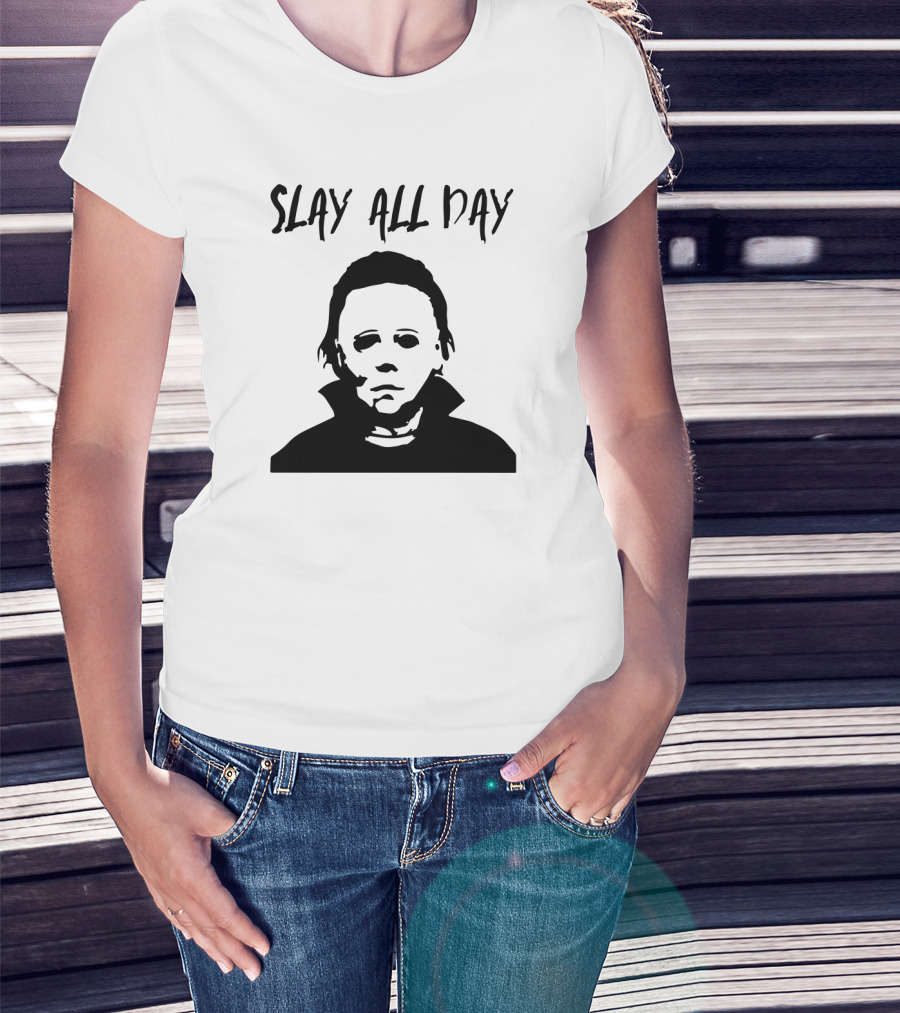 The Slay All Day Michael Myers T-shirt is designed for everyday wear and a consistent fit. Fabric is pre-shrunk ring-spun cotton with durable stitching. See the size chart below for exact measurements.