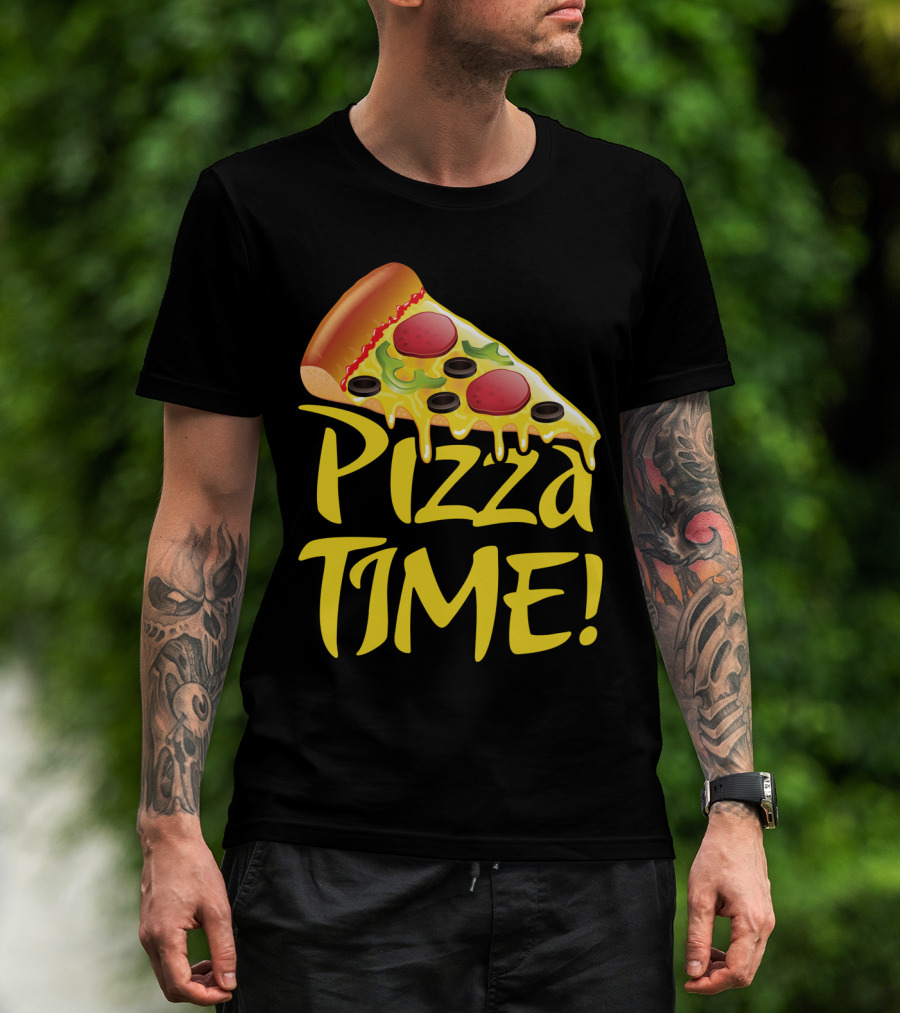 The Pizza Everyday Time Pizza Time Slice T-shirt is designed for everyday wear and a consistent fit. Fabric is pre-shrunk ring-spun cotton with durable stitching. See the size chart below for exact measurements.