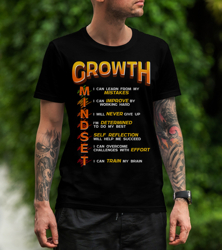The Growth Mindset Teacher Classroom Brain Motivation Mistakes Improve Never Determined Self Reflection Effort Train T-shirt is designed for everyday wear and a consistent fit. Fabric is pre-shrunk ring-spun cotton with durable stitching. See the size chart below for exact measurements.