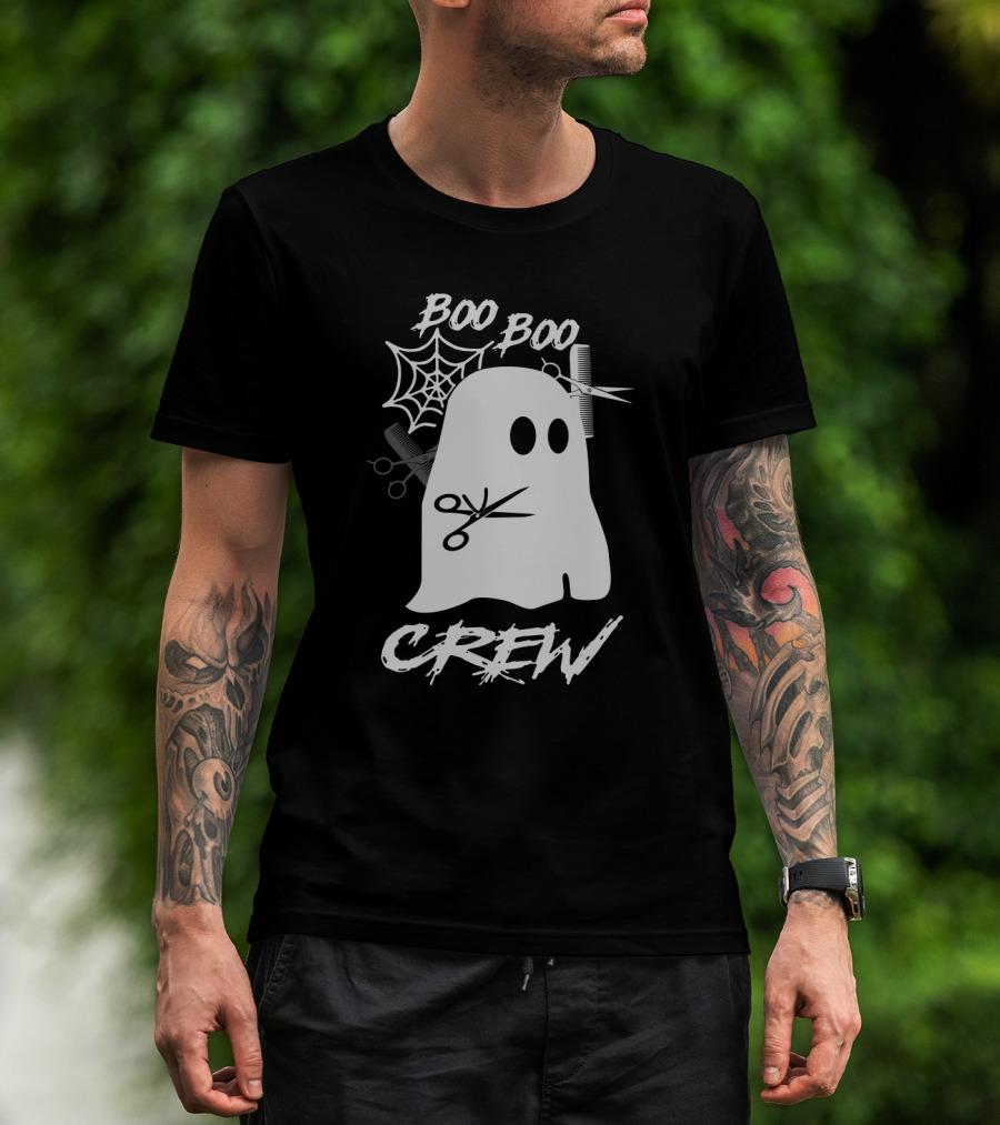 The Boo Boo Crew Ghost Hairdresser with Scissors and Spiderwebs T-shirt is designed for everyday wear and a consistent fit. Fabric is pre-shrunk ring-spun cotton with durable stitching. See the size chart below for exact measurements.