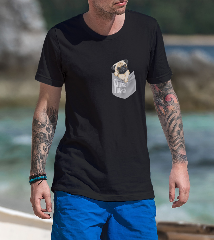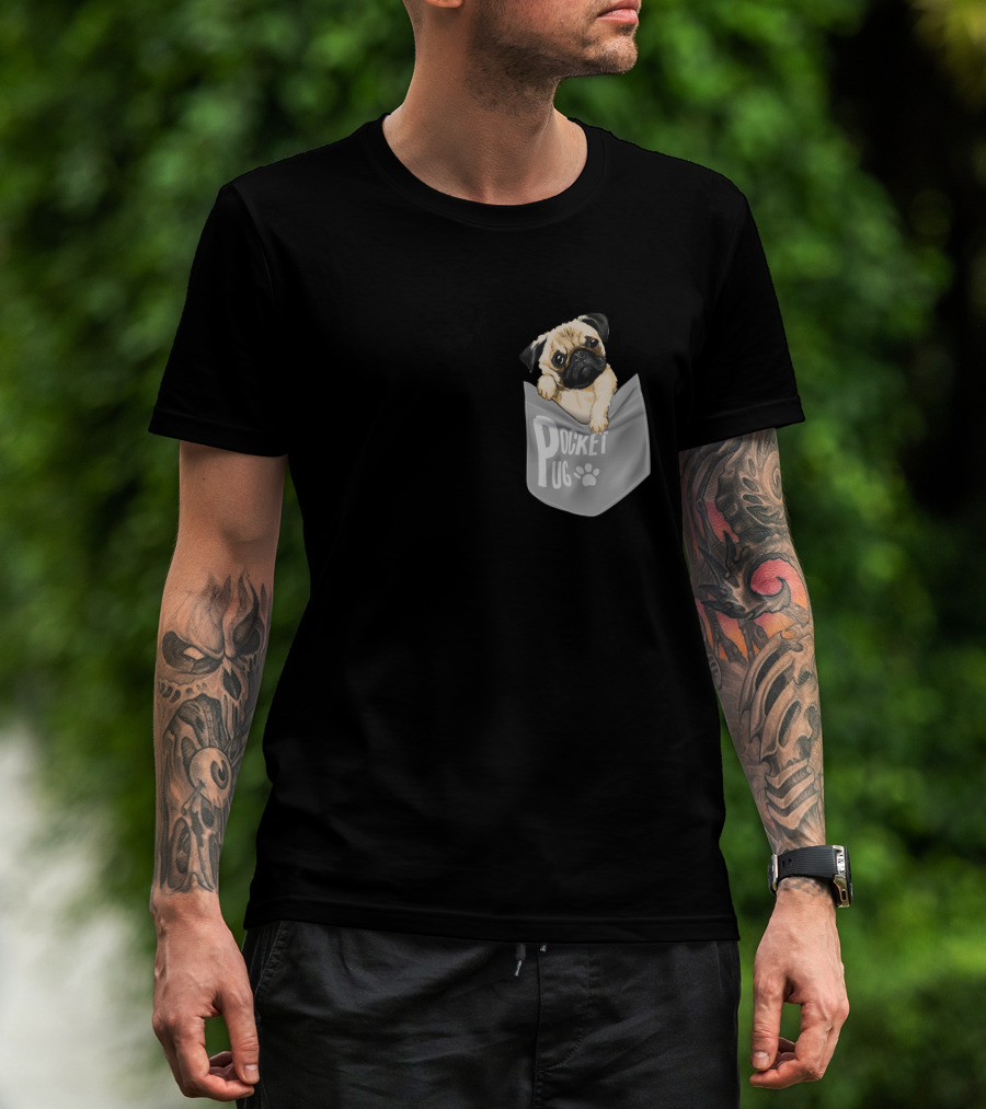 The Pocket Pug Puppy Peeking Out of Pocket T-shirt is designed for everyday wear and a consistent fit. Fabric is pre-shrunk ring-spun cotton with durable stitching. See the size chart below for exact measurements.