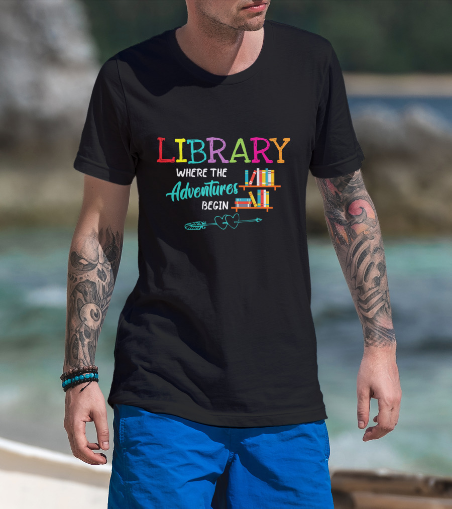 Library Where The Adventures Begin Colorful Books And Arrow T-Shirt
