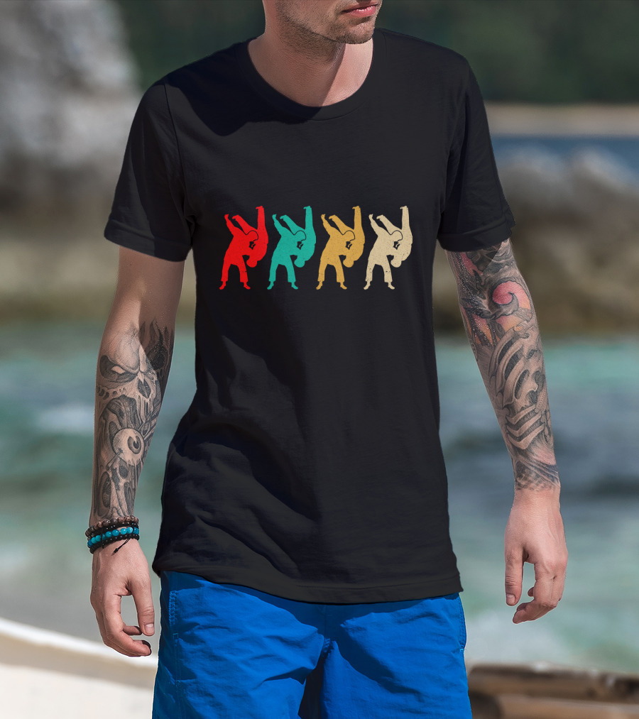 Vintage Judo Throw Silhouettes Red Teal Yellow Beige T-Shirt