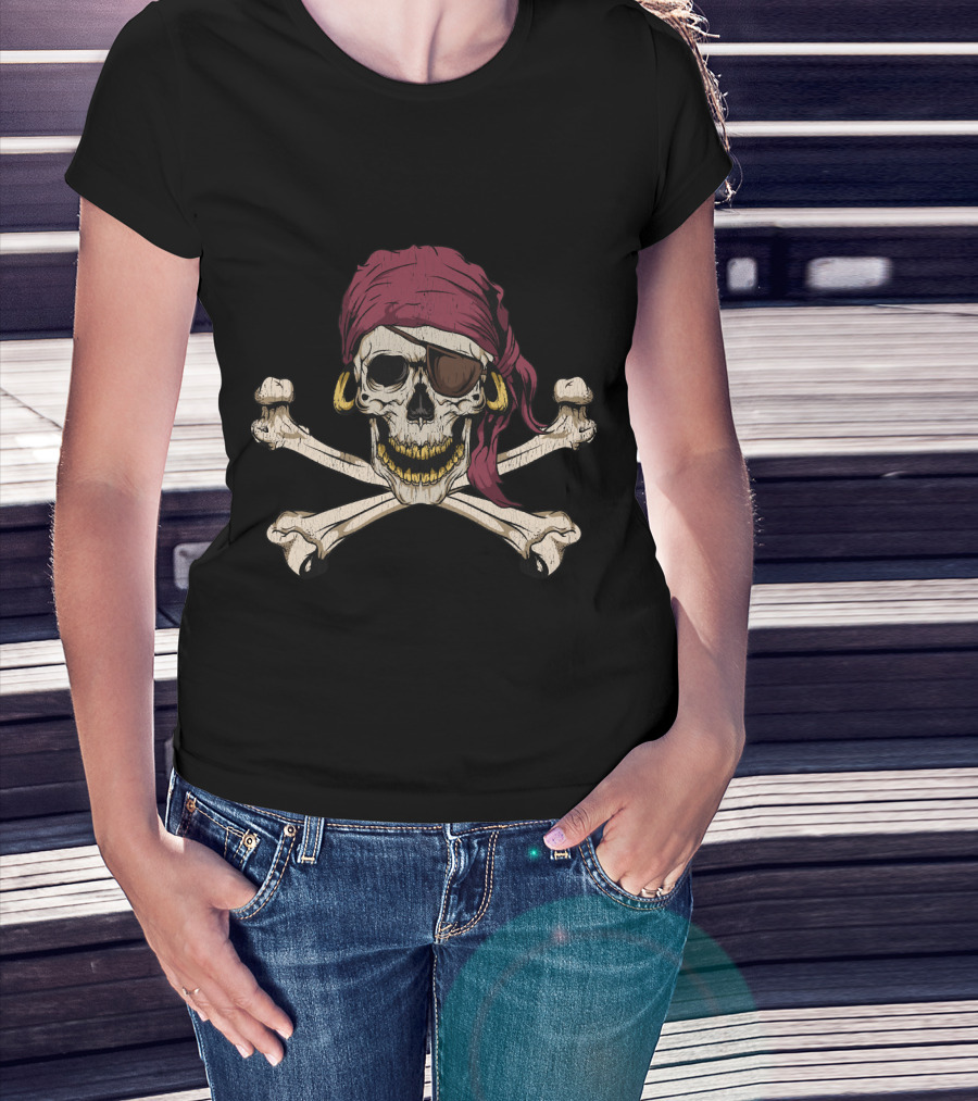 Pirate Jolly Roger Skull Crossbones Bandana Eyepatch Earring T-Shirt