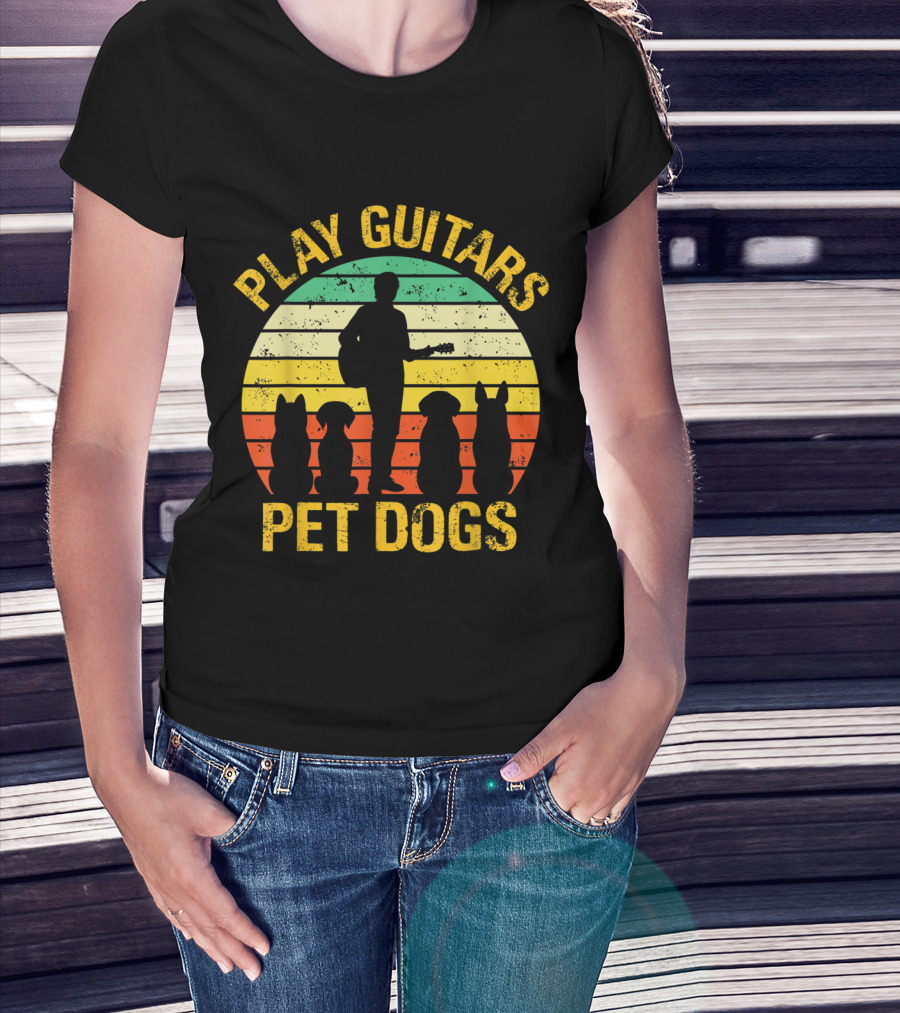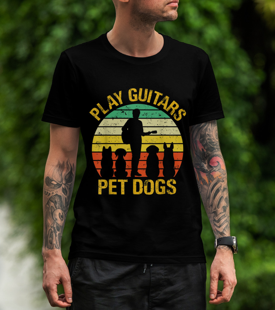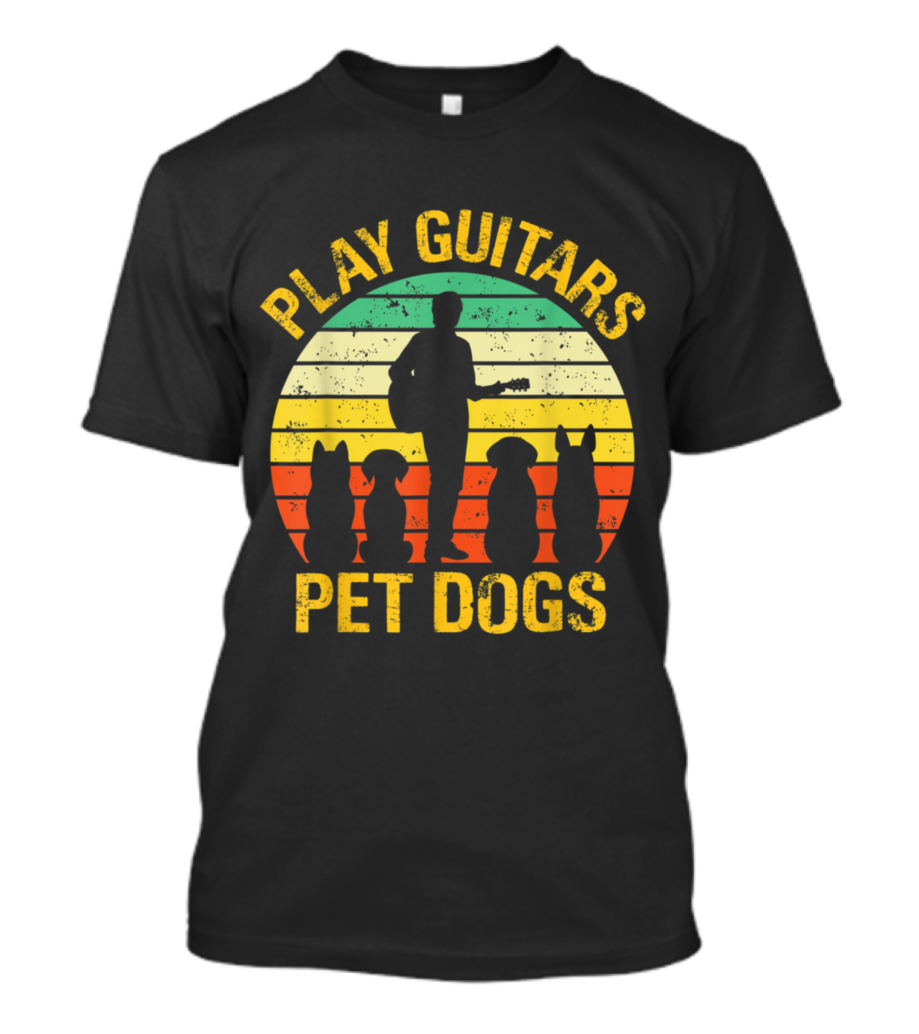 The Retro Vintage Play Guitars Pet Dogs Silhouette Sunset T-shirt is designed for everyday wear and a consistent fit. Fabric is pre-shrunk ring-spun cotton with durable stitching. See the size chart below for exact measurements.