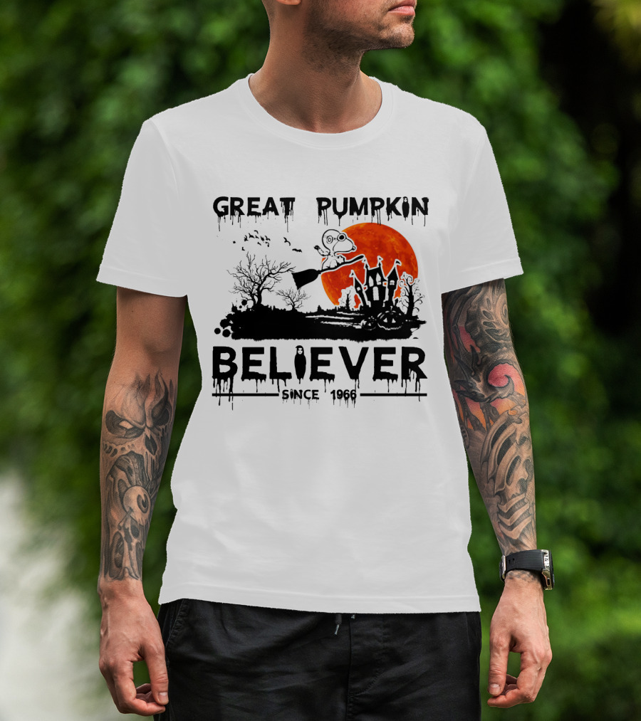 The Great Pumpkin Believer Snoopy Since 1966 Halloween Moon Scene T-shirt is designed for everyday wear and a consistent fit. Fabric is pre-shrunk ring-spun cotton with durable stitching. See the size chart below for exact measurements.