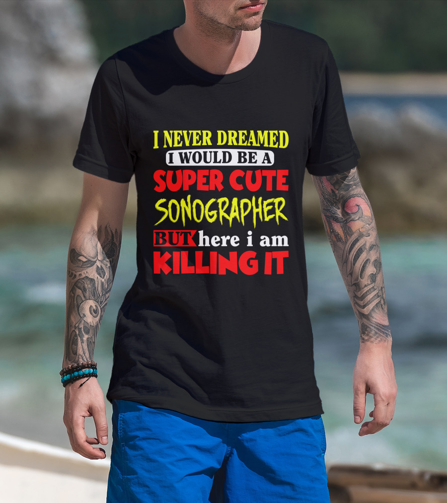 The I Never Dreamed I Would Be A Super Cute Sonographer But Here I Am Killing It T-shirt is designed for everyday wear and a consistent fit. Fabric is pre-shrunk ring-spun cotton with durable stitching. See the size chart below for exact measurements.