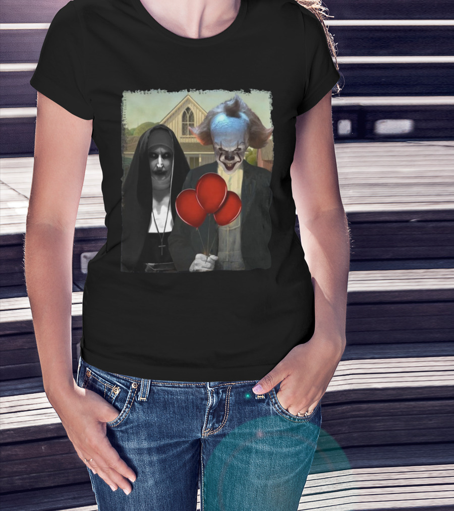 Pennywise And Valak American Gothic Parody With Red Balloons T-Shirt